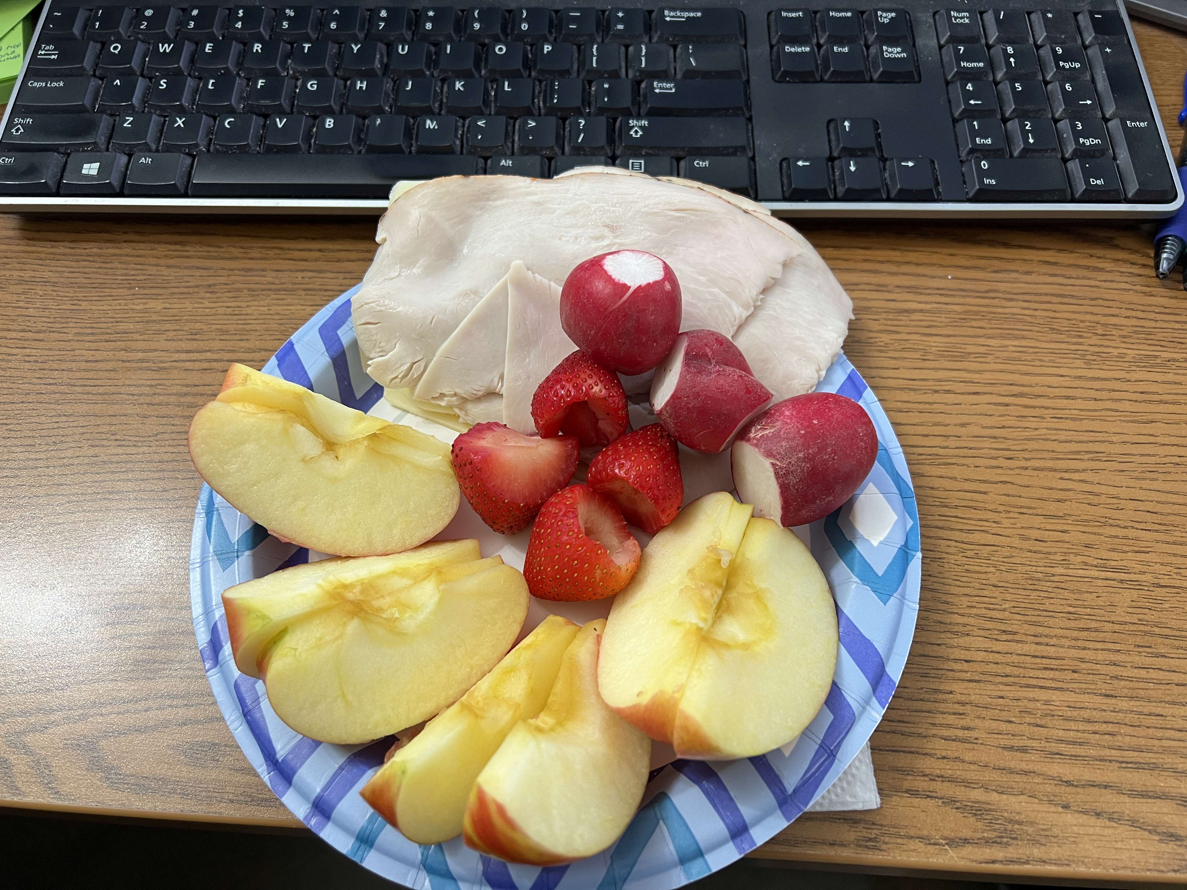 1. Good for you. I try to remember not to eat at the keyboard. One, I need to give my eyes a rest from the screen. 2) Even fruit leaves its mark on the keyboard 🙂