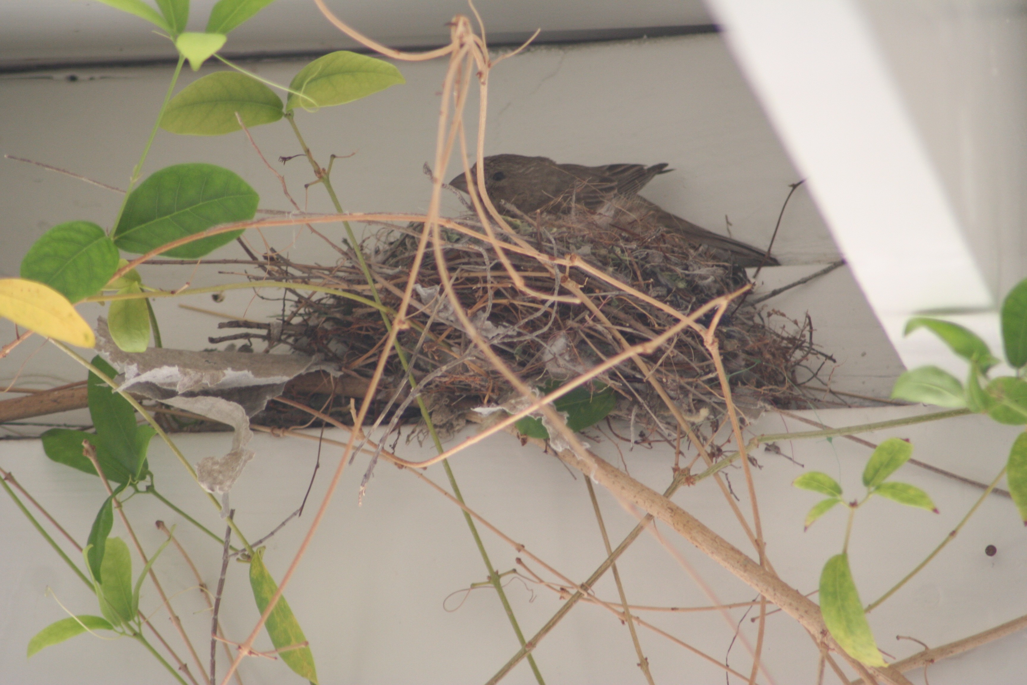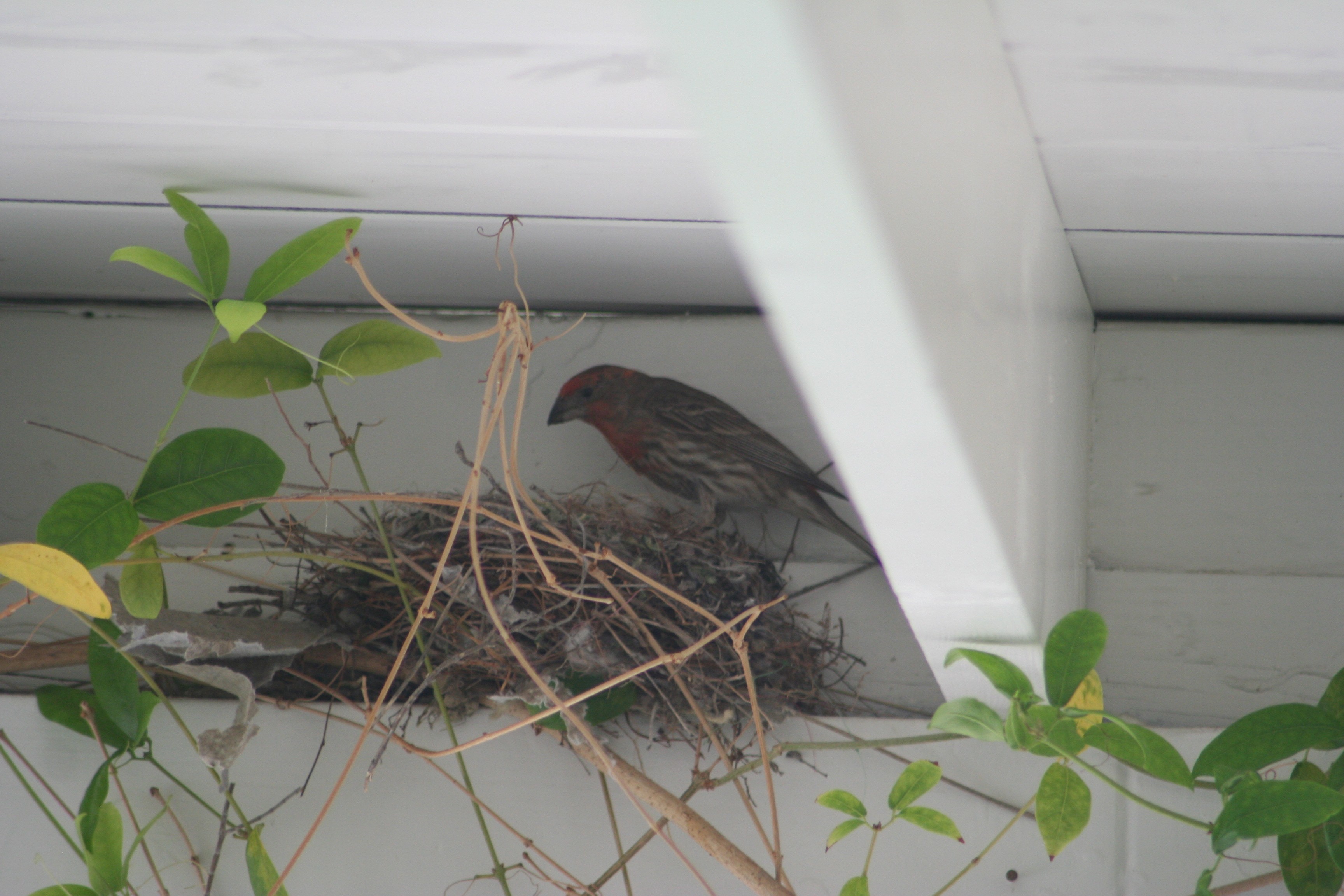 I haven’t gotten a decent picture of the chicks yet, mainly because getting this close will get me dive bombed by a couple of house finches that are trying to peck my eyes out. Since I like my eyes just as they are, i.e., unpecked, I’ll try to respect the privacy of the finches. Or at least not try again until I have some decent safety goggles.