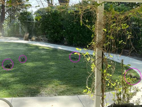 Along with a handful of finches, mourning doves, and a couple of juncos, they were decimating the bird seed that gets put out every day. Curiously, there was also a rabbit way off in the far corner, under the bushes. We used to have them all of the time, but didn’t have any for months and months.