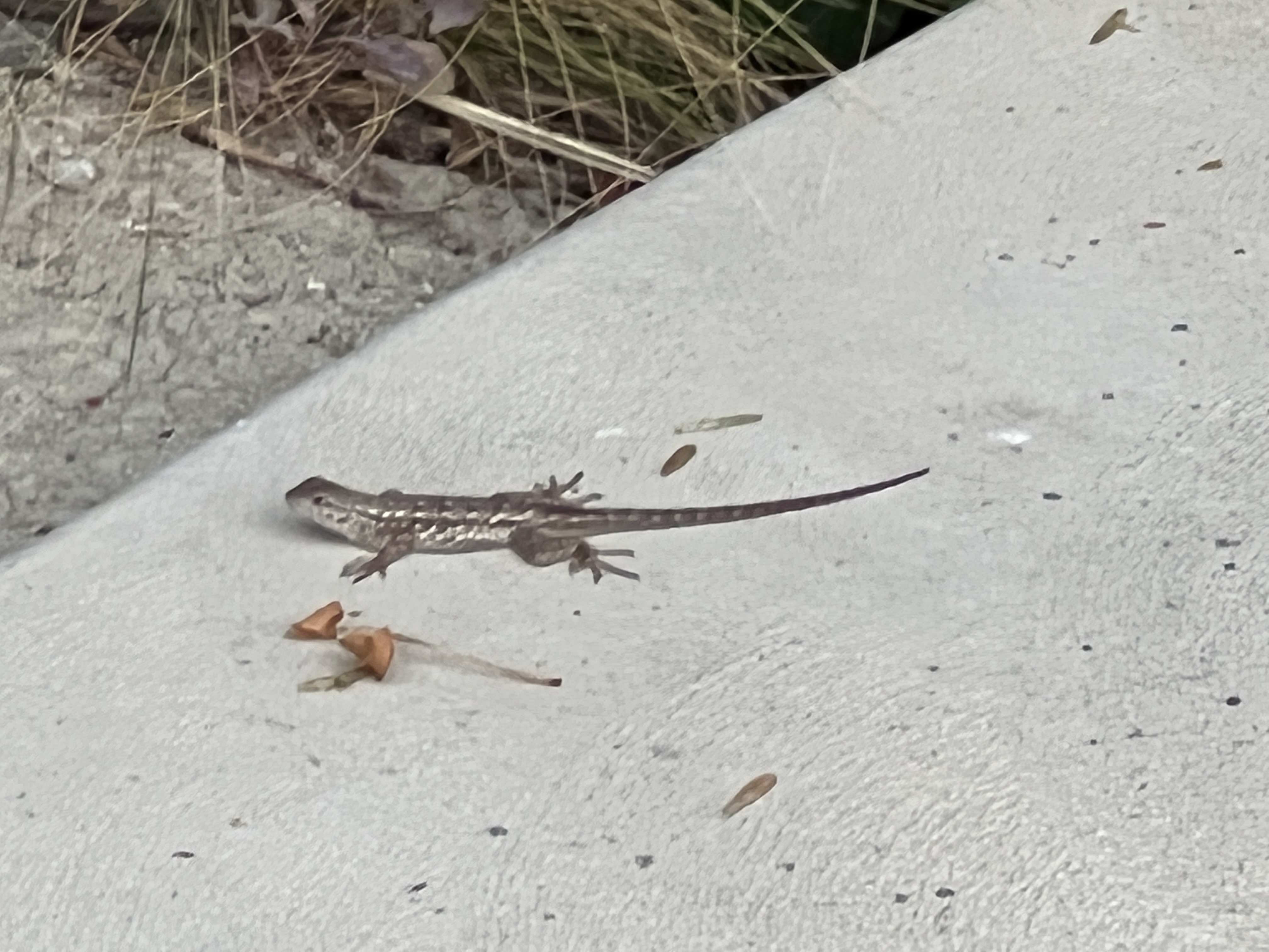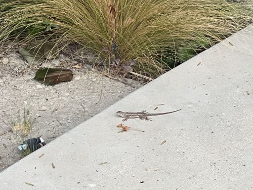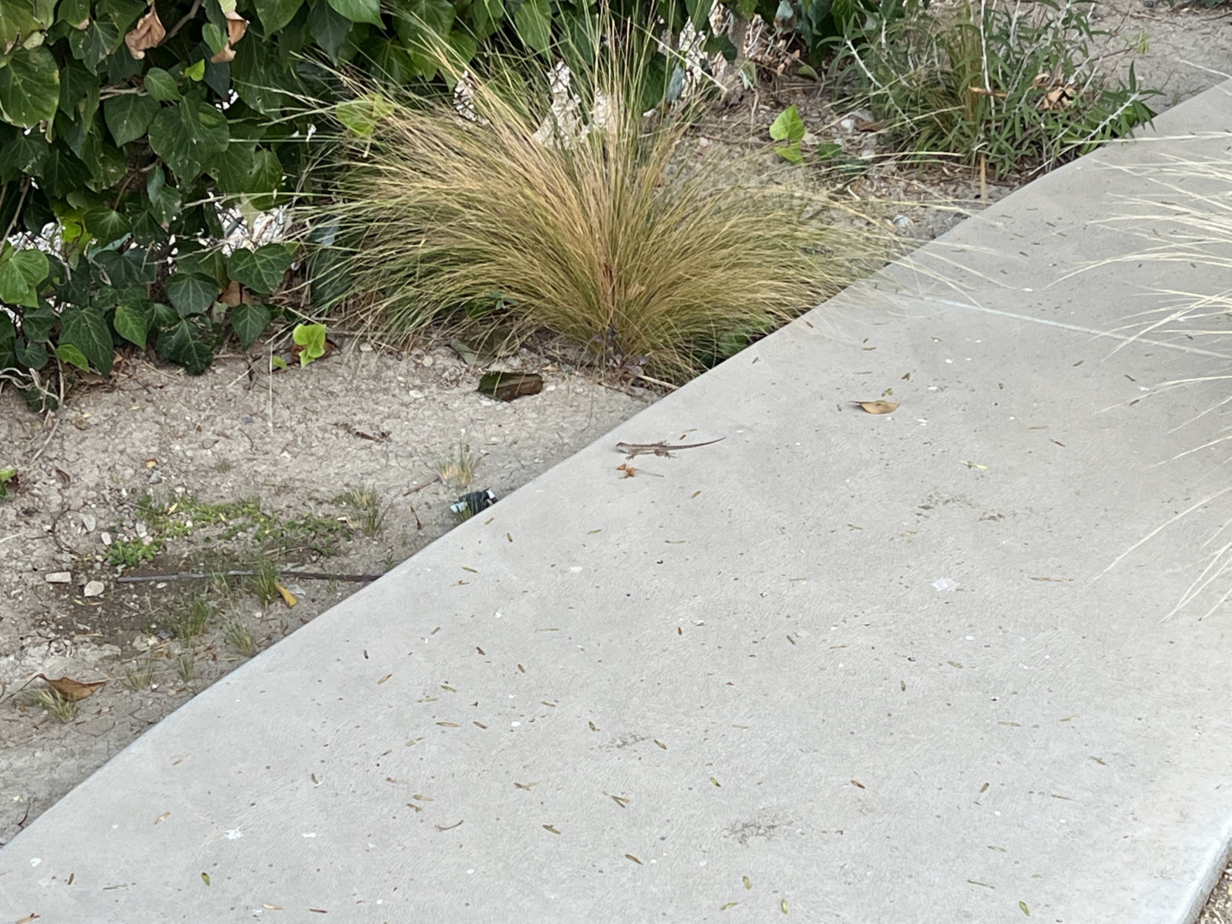 But in my experience, these fence lizards and the odd alligator lizard are all off in their hidey holes a good hour or so before sunset. Maybe it’s so hot these last few days that the sidewalk is still hot enough for this critter to be sucking up infrared photons from below, but it really hasn’t been. I’ve seen days when it’s MUCH hotter, 10° to 15º hotter.