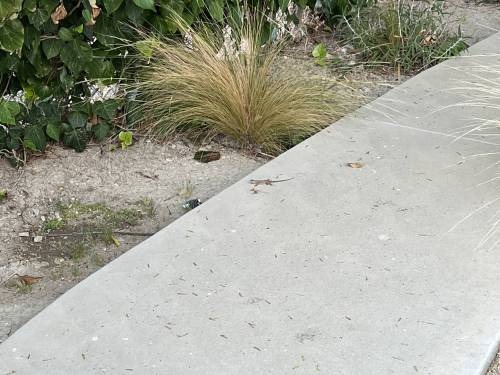 This critter’s also fearless, guarding their spot on the sidewalk and not budging for anything. I was within a couple of feet before it finally decided that discretion was the better part of valor and it retreated into the bushes along the fence.