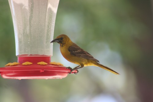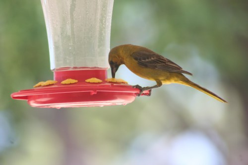 Last week I saw a large, bright yellow bird trying to do a “carrier landing” on the hummingbird feeder. My assumption was that it might be a yellow-headed blackbird, since that’s the only large, bright yellow bird I’ve ever seen around here.