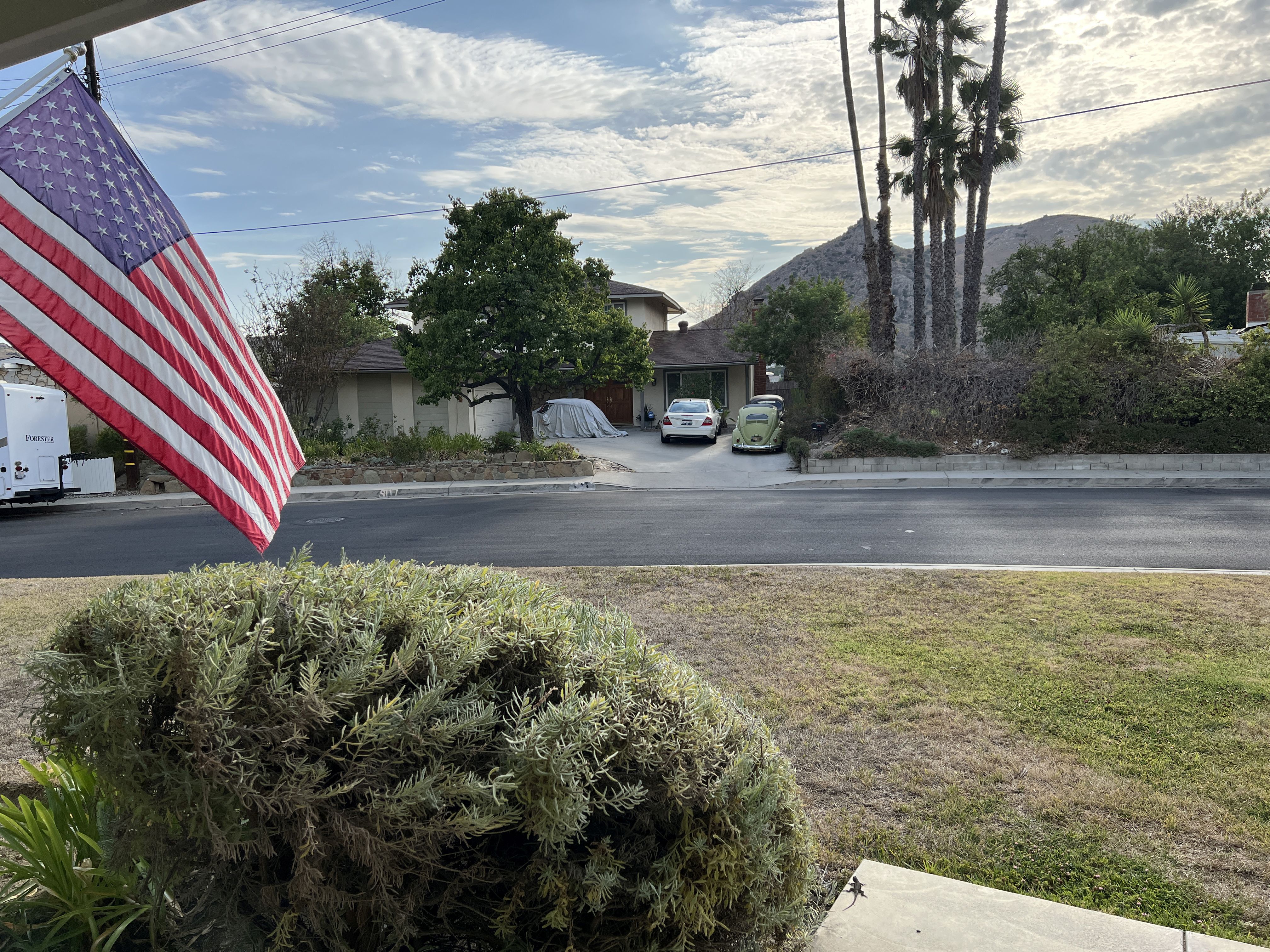 He’s also there to eat! He doesn’t do this for his health. The presence of hawks, mockingbirds, and various other predators have a bearing on the odds of surviving the afternoon out there somewhat in the open. But right there along the far edge of the sidewalk… See it? Dinner on the hoof!