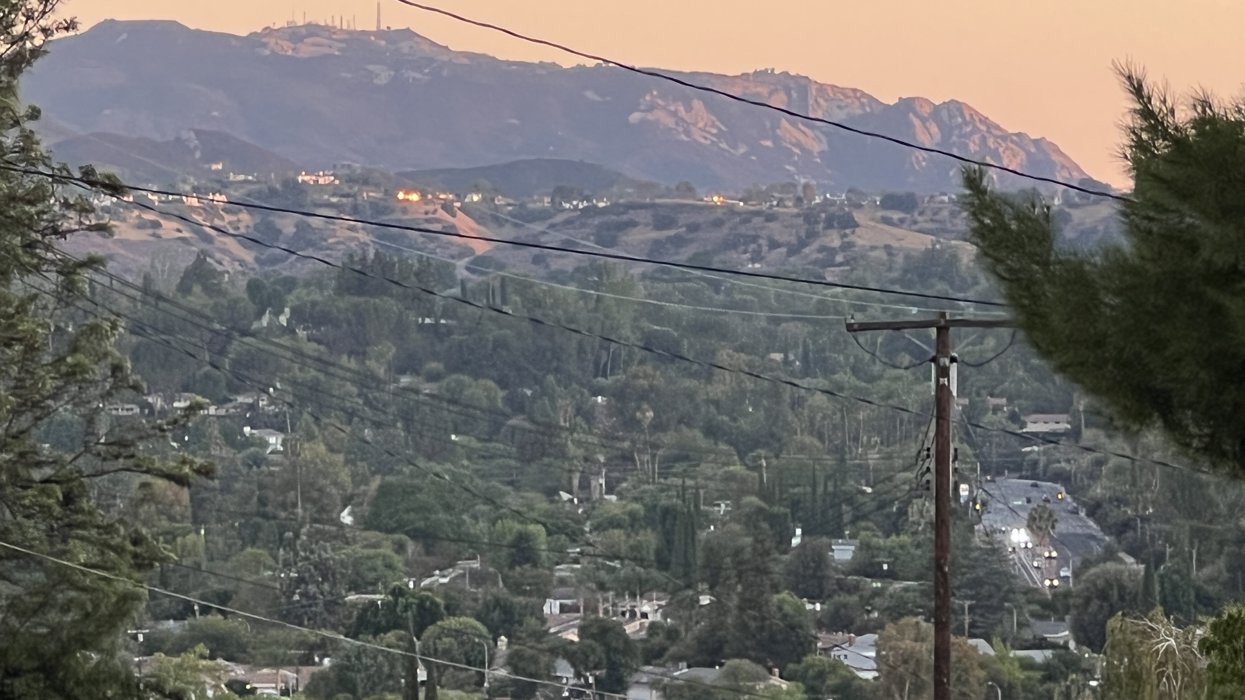 Looking due south, with the sun setting off to our right, a number of houses on the hillsides of Woodland Hills and Calabasas will catch the setting sun just right. The glint and reflections can be quite bright.