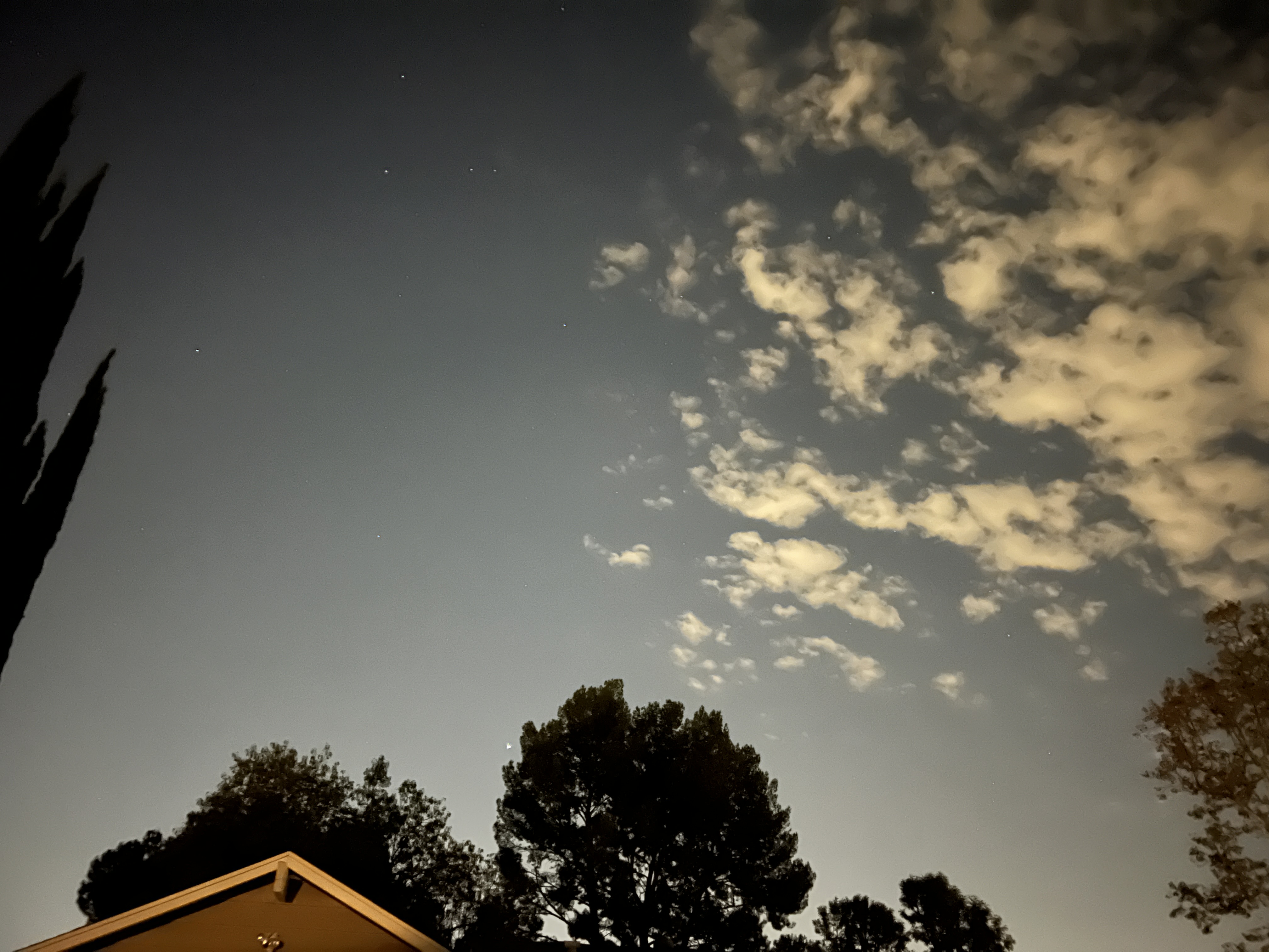 That’s Jupiter, very bright, just to the left of that big tree in the lower center. Saturn is up behind those clouds somewhere, not quite as bright, a little bit yellowish colored. Binoculars will let you pick out the Galilean moons of Jupiter, and it doesn’t take much of a telescope to show them both as disks, Saturn with its rings.