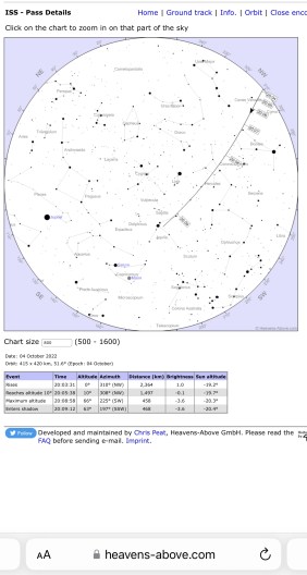 A little earlier, rising at 19:16 in the northwest, but with autumn here it should be plenty dark and the ISS will be REALLY bright. Again the ISS’s path will be almost straight overhead, and while it will fade to darkness in orbital sunset before it gets to the far horizon, it still covers most of the sky.