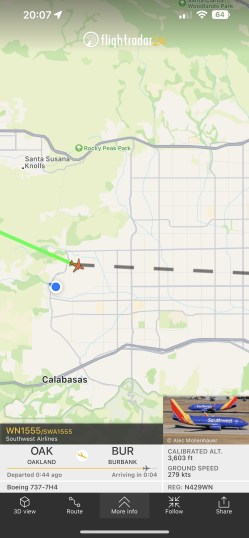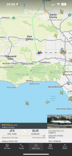 Also visible are two airliners going into Burbank’s Runway 8. The lower bright diagonal line is Southwest flight #1555 coming in from Oakland, while the curving line on the right margin (with the red & green navigation lights showing as well) is JetBlue flight #359 coming in from JFK in New York City. (Images from FlightRadar 24.)