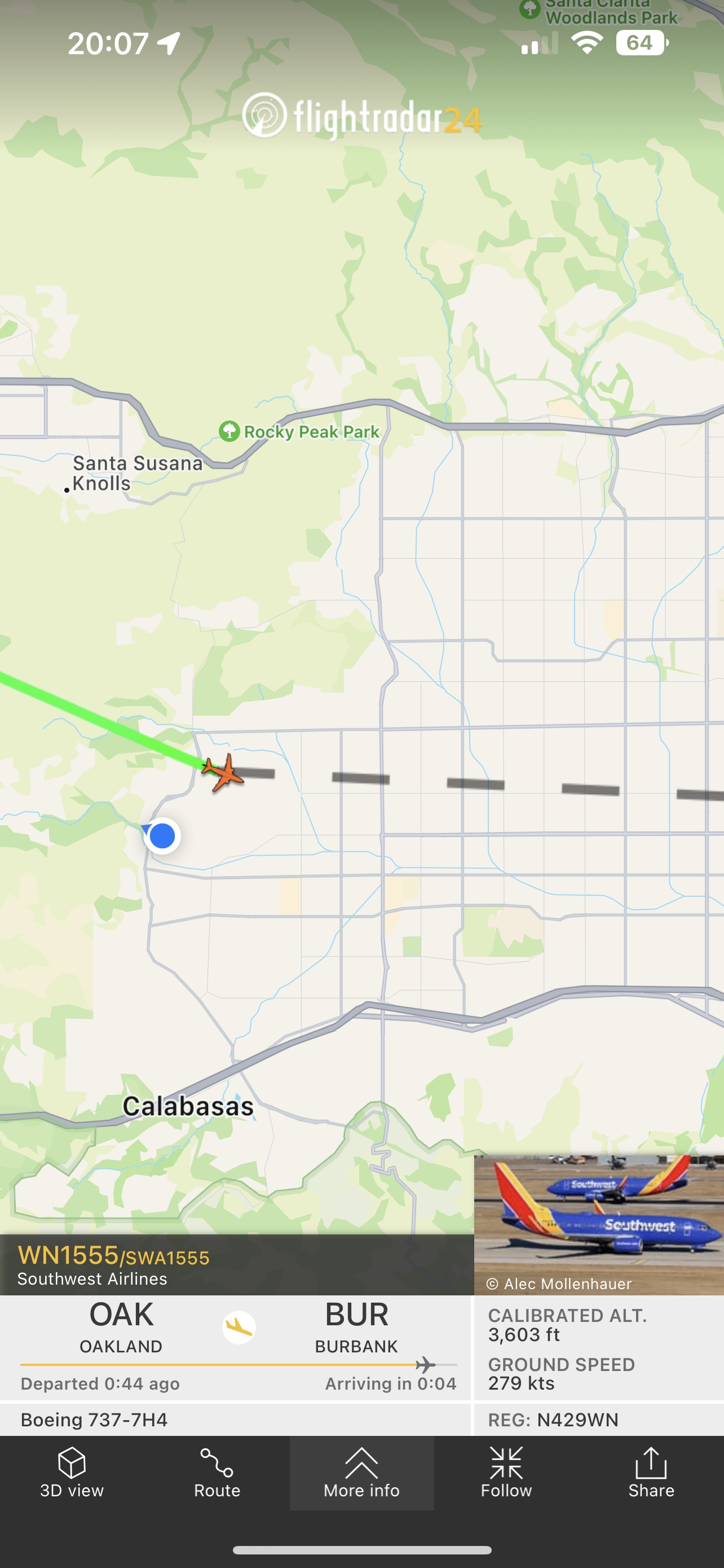 Also visible are two airliners going into Burbank’s Runway 8. The lower bright diagonal line is Southwest flight #1555 coming in from Oakland, while the curving line on the right margin (with the red & green navigation lights showing as well) is JetBlue flight #359 coming in from JFK in New York City. (Images from FlightRadar 24.)