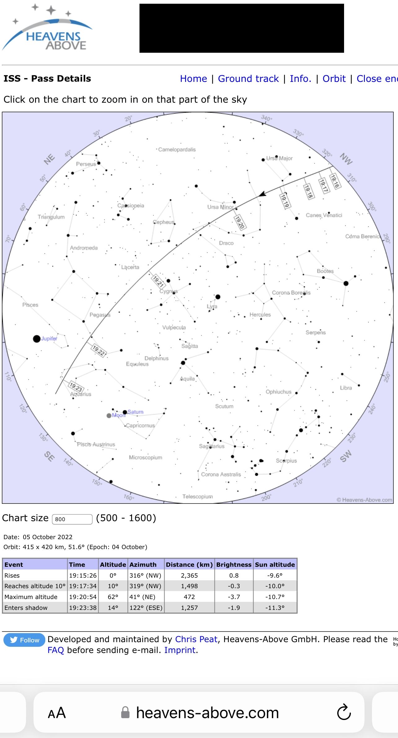 A little earlier, rising at 19:16 in the northwest, but with autumn here it should be plenty dark and the ISS will be REALLY bright. Again the ISS’s path will be almost straight overhead, and while it will fade to darkness in orbital sunset before it gets to the far horizon, it still covers most of the sky.