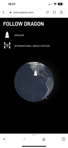 This is the SpaceX “Follow Dragon” site and, assuming it’s fairly accurate, when I had just seen the ISS come over and was expecting Dragon to be right behind, Dragon was actually over southern China, on a path toward northern Japan and Alaska.