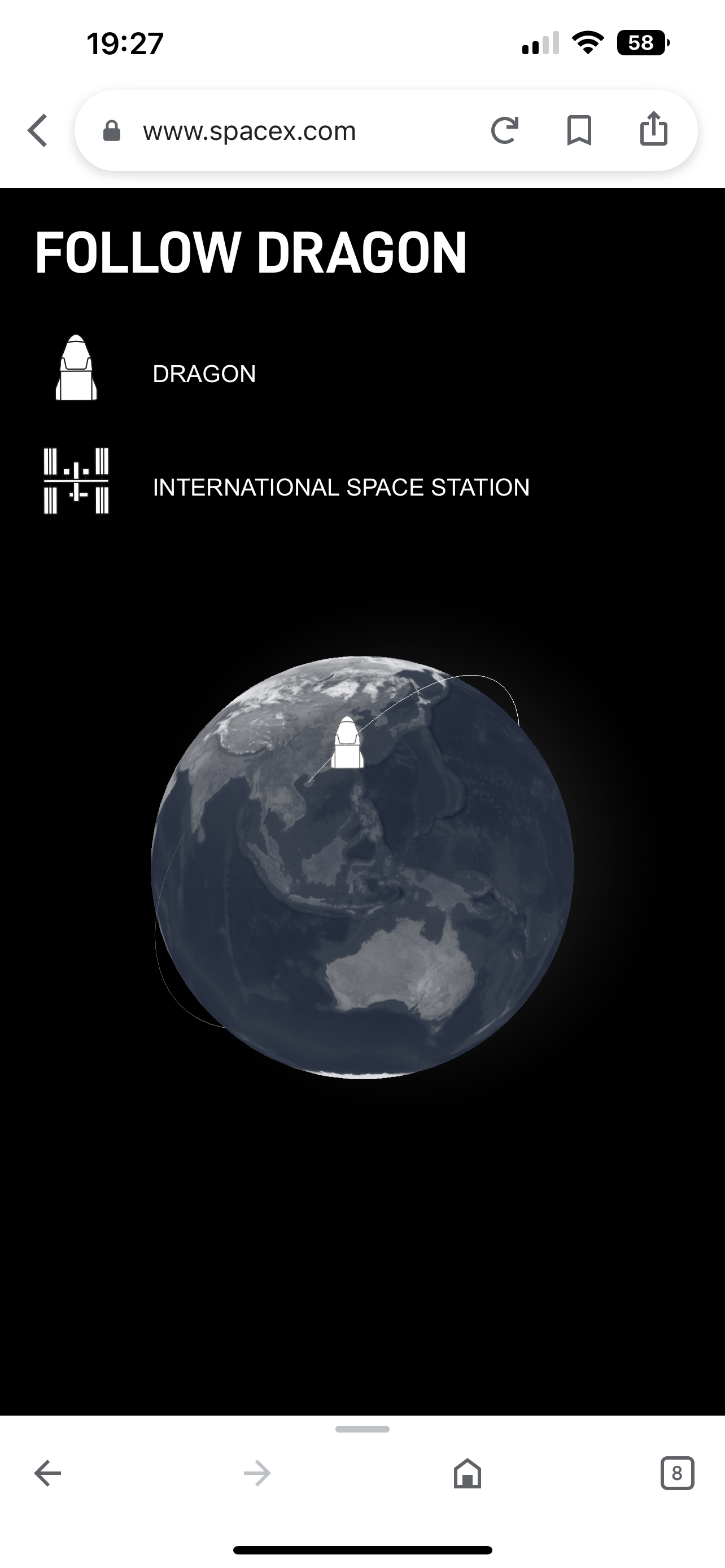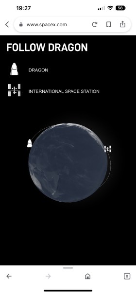 This is the SpaceX “Follow Dragon” site and, assuming it’s fairly accurate, when I had just seen the ISS come over and was expecting Dragon to be right behind, Dragon was actually over southern China, on a path toward northern Japan and Alaska.