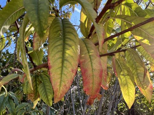 One of our fruit trees (which has NEVER had any fruit on it) is kinda sorta maybe turning a little. Most leaves are turning straight to brown, but a few are giving it the old college try. (I don’t know what old college they attended.)