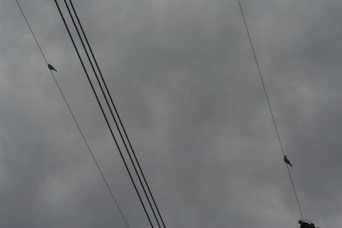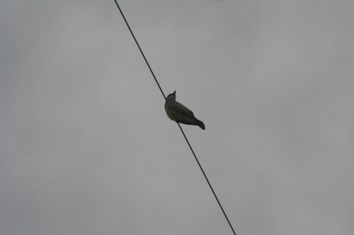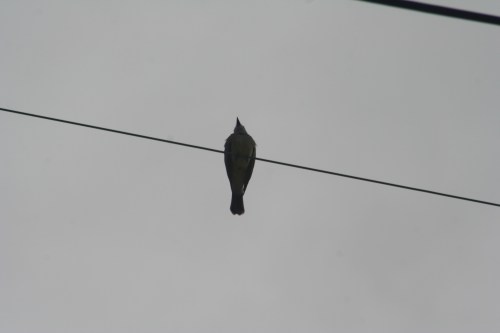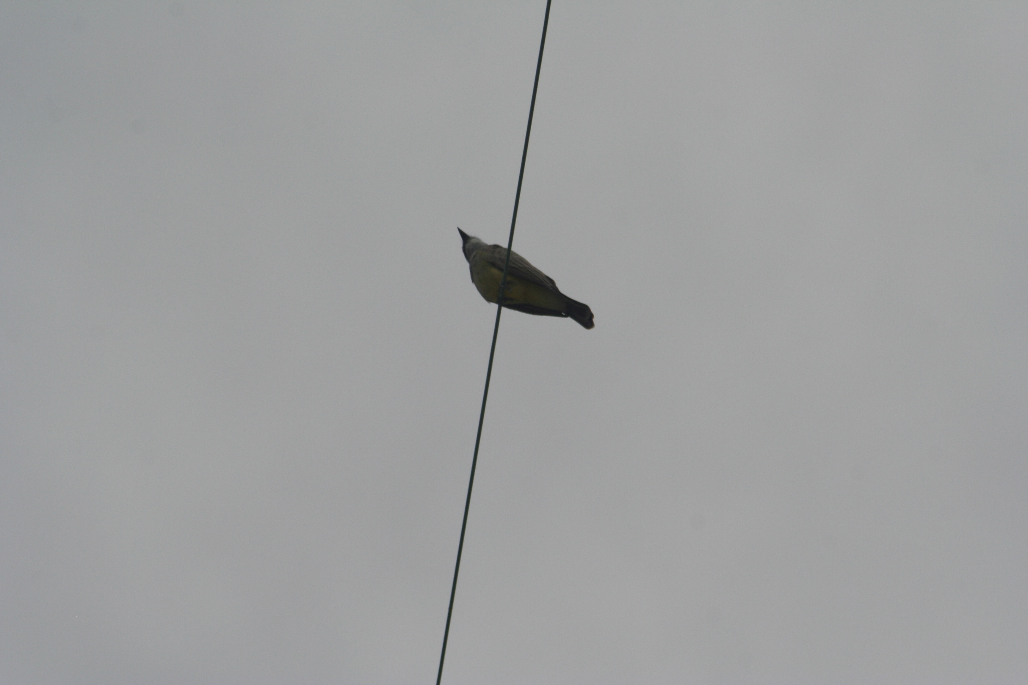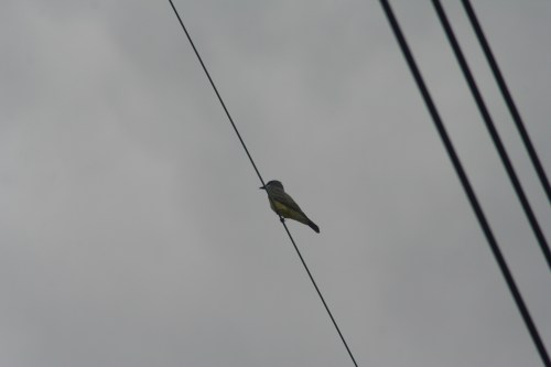 Bingo, a Cassin’s Kingbird. Actually, a pair. The yellow breast can be seen easily, despite the lousy, cloudy lighting.