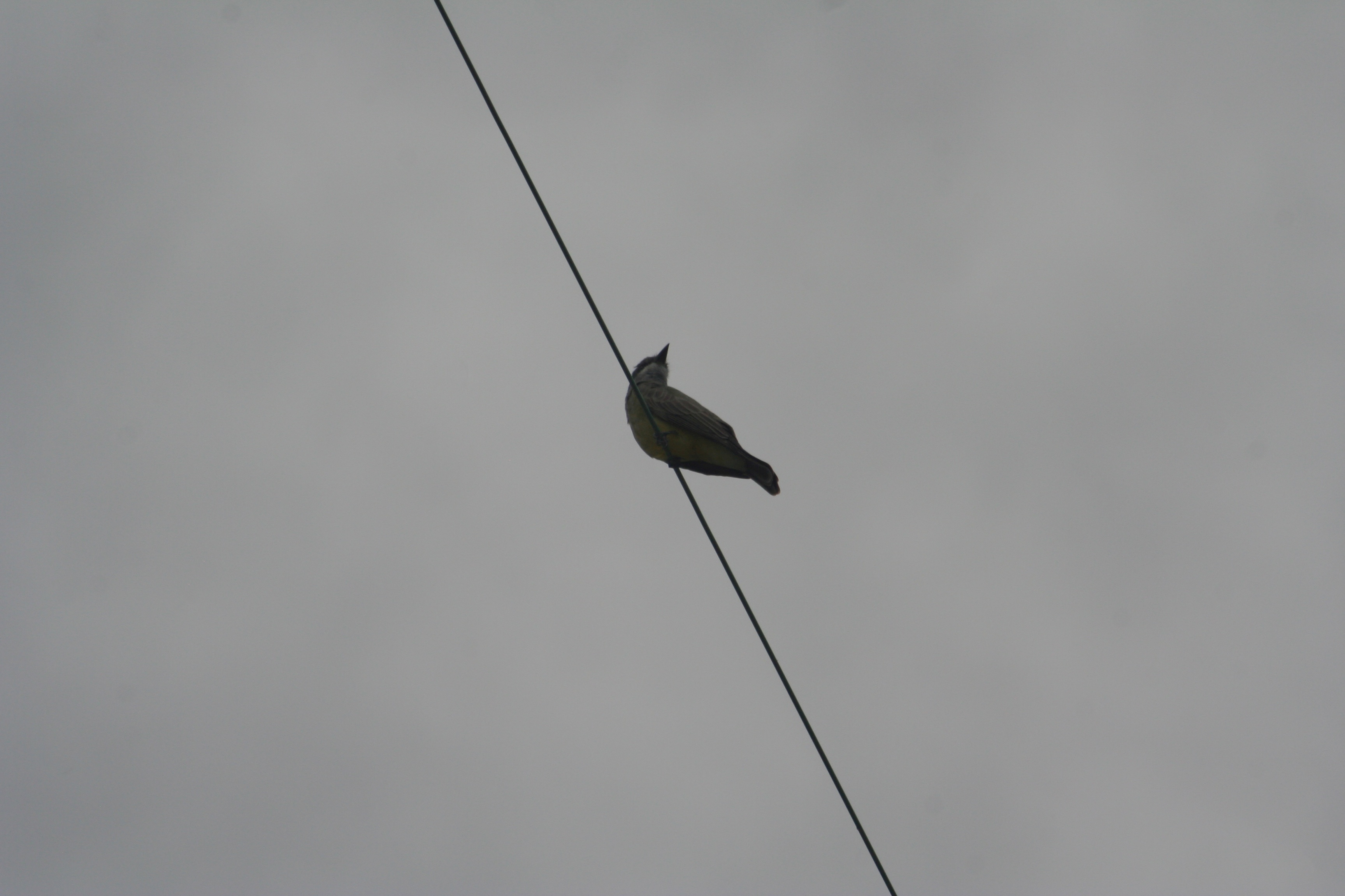 My first clue was the song. I hadn’t heard it before and I couldn’t see any new birds around, but I could hear them (probably two, at least) flitting around in the trees off the back yard. The Cornell Lab Merlin Bird ID app (which is wonderful, highly recommended if this is your thing) now has a “Sound ID” feature which is fantastic. Whipping it out, it immediately ID the song as a Cassin’s Kingbird. A photo showed it to be bigger than the juncos and house finches, smaller (maybe) than a mockingbird, with a yellow breast.