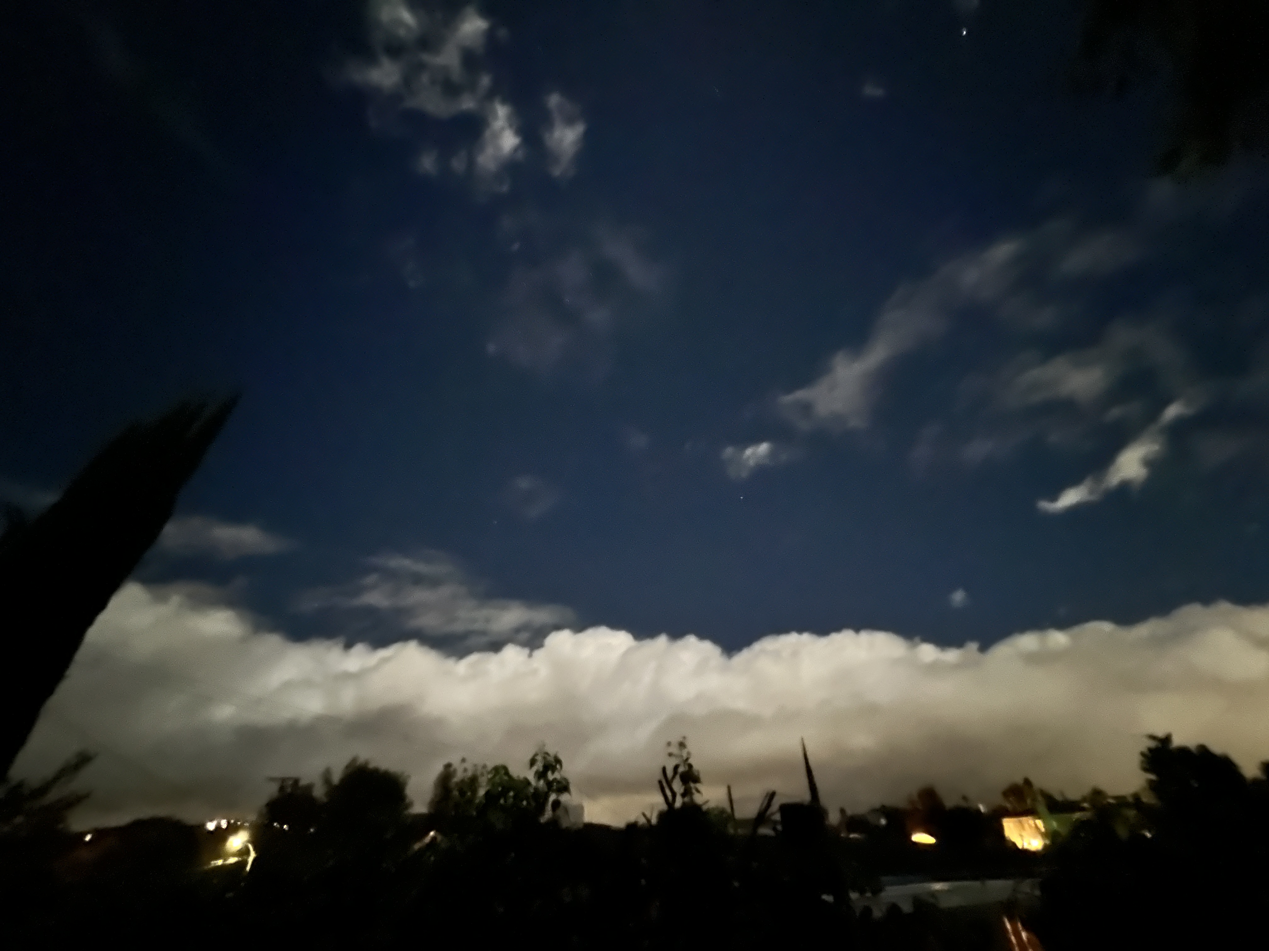A week ago we were hoping for clear skies for the total lunar eclipse, but got rain and a solid overcast. The following night however, after some of the clouds had broken up, we had bright moonlight illuminating the remaining banks of clouds up over the mountains to the north.