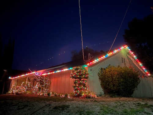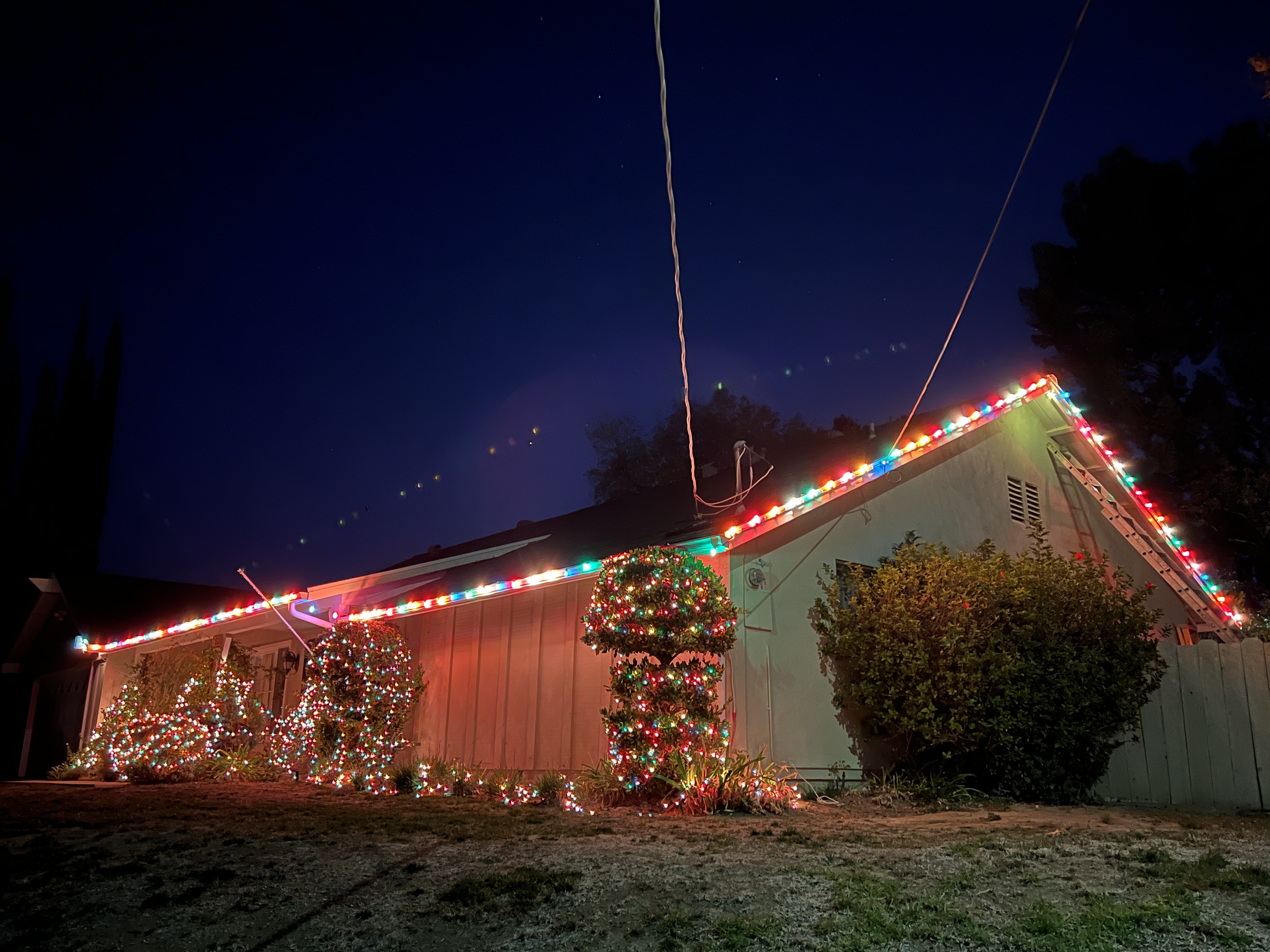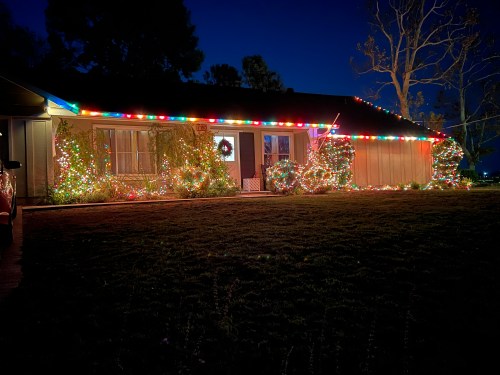We got probably half of them up – still need the lights over the garage, the icicle lights along the gutters, the lights along the driveway and in the rose bushes, the lights at the end of the house in the hibiscus bushes.