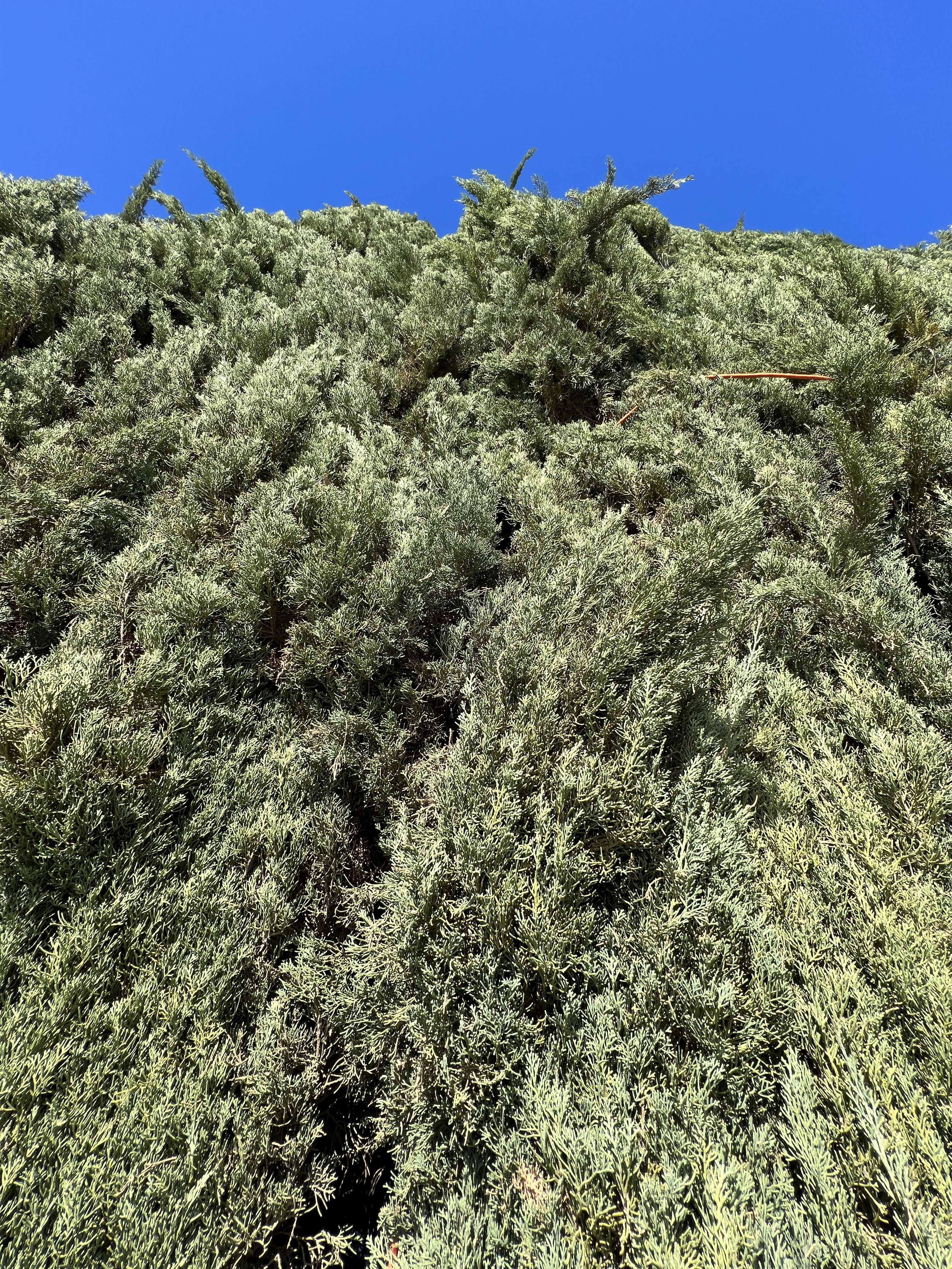 While putting up Christmas lights on Saturday I had the most odd visual experience. In order to run an extension cord from the garage roof across a sidewalk and over to the tall, thin, Italian cypress trees that line the yard, I was right up against the trees, reaching in for the extension cord that I was threading down through the branches.