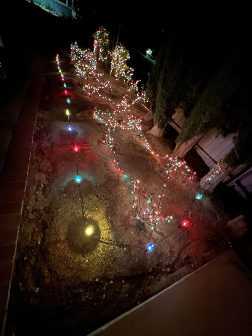 For tonight, enjoy a couple of quick shots of the lights on the rose bushes next to the driveway.