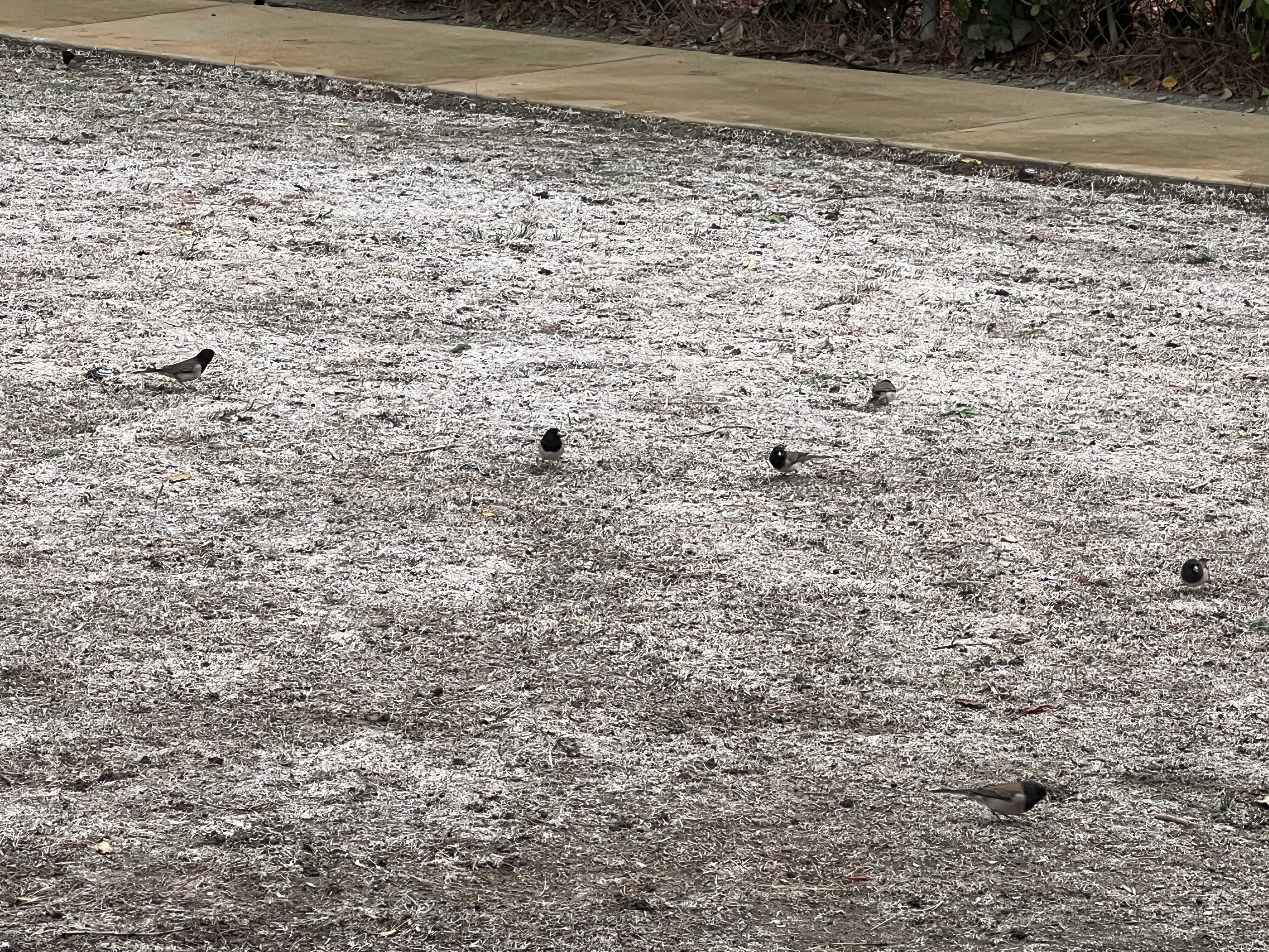I had mentioned a month ago that the Juncos had returned, a flock of a dozen at least, maybe 16 to 18. It’s hard to tell, when seed gets thrown out they’re flitting and jumping and fluttering all over the place. And they’re tough to get a photo of, since at first sight of me, even from inside the dining room, they’re bugging out.
