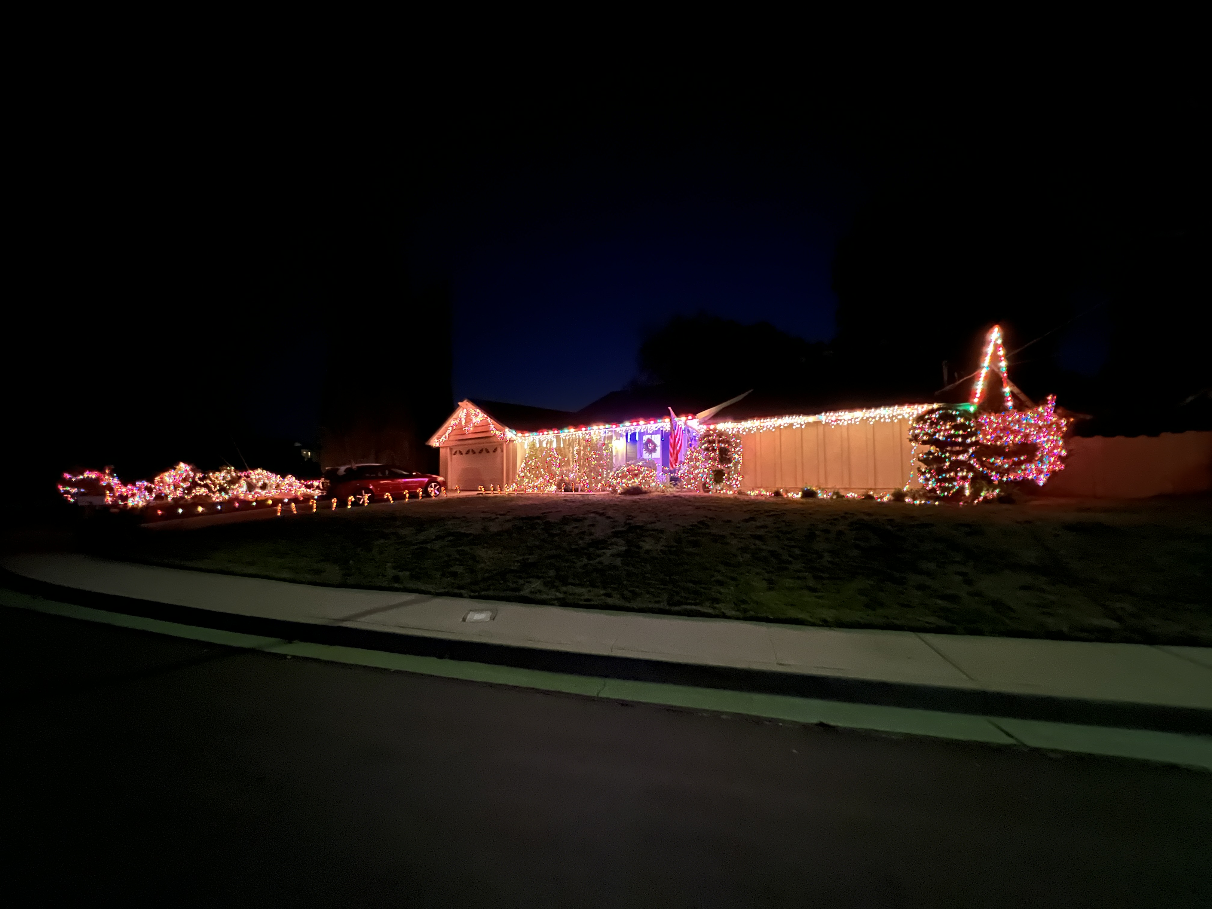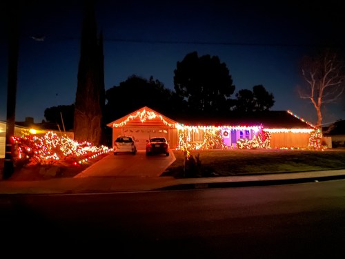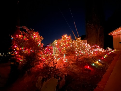 Christmas is a week away. This year’s display is still only maybe 60% or so of what we used to have at the Pomelo house, but that house was over twice as big and had a lot of trees and plants in the front yard to drape lights off of. However, compared to the previous three years here, this is about 15% more than last year, so that’s not too bad.