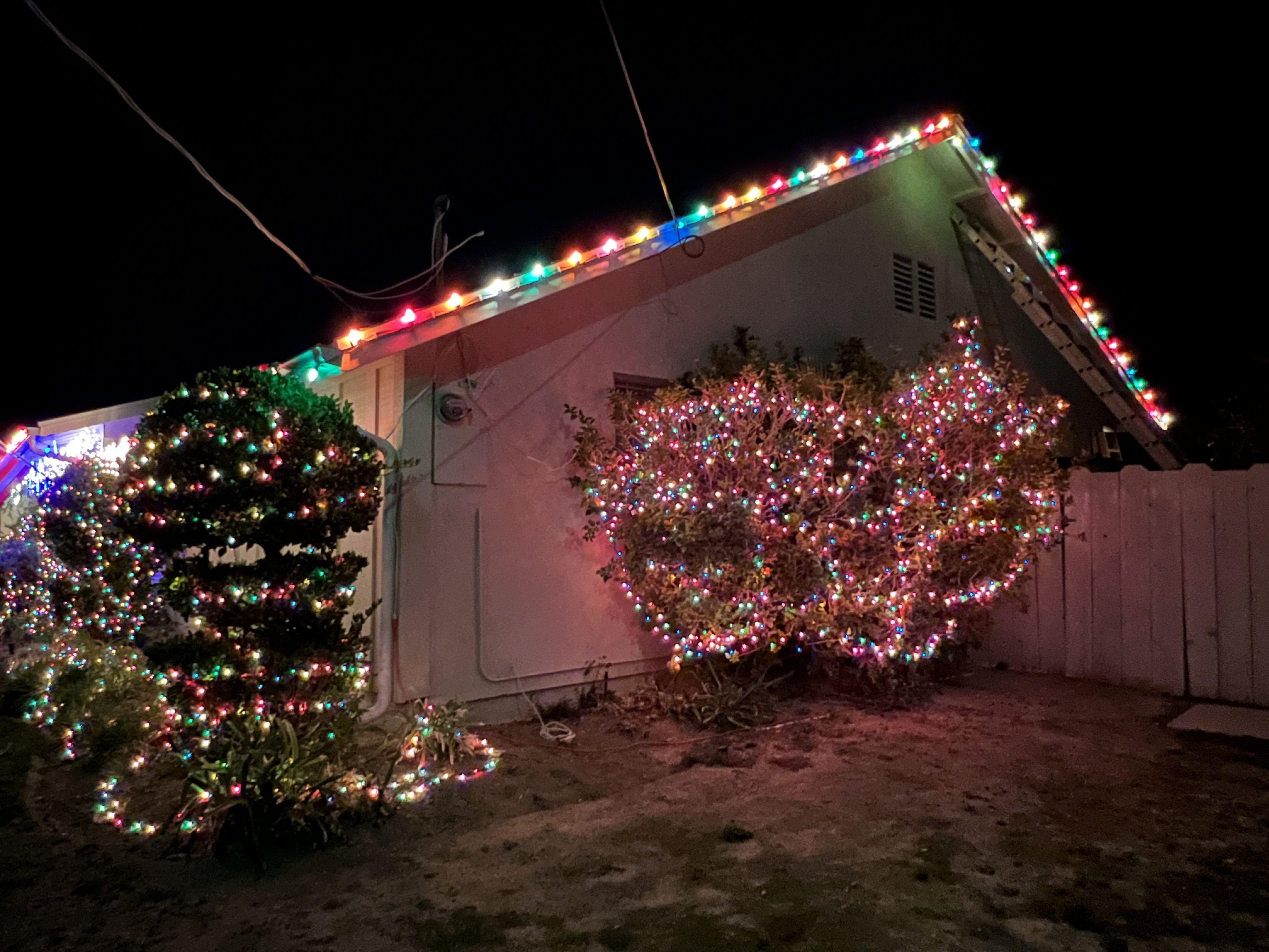 At the far end of the house I got a couple of new strings into the big hibiscus bush. I would love to get another couple of strings of lights in there to really, REALLY cover it, but as Dirty Harry said, a man’s got to know his limitations.