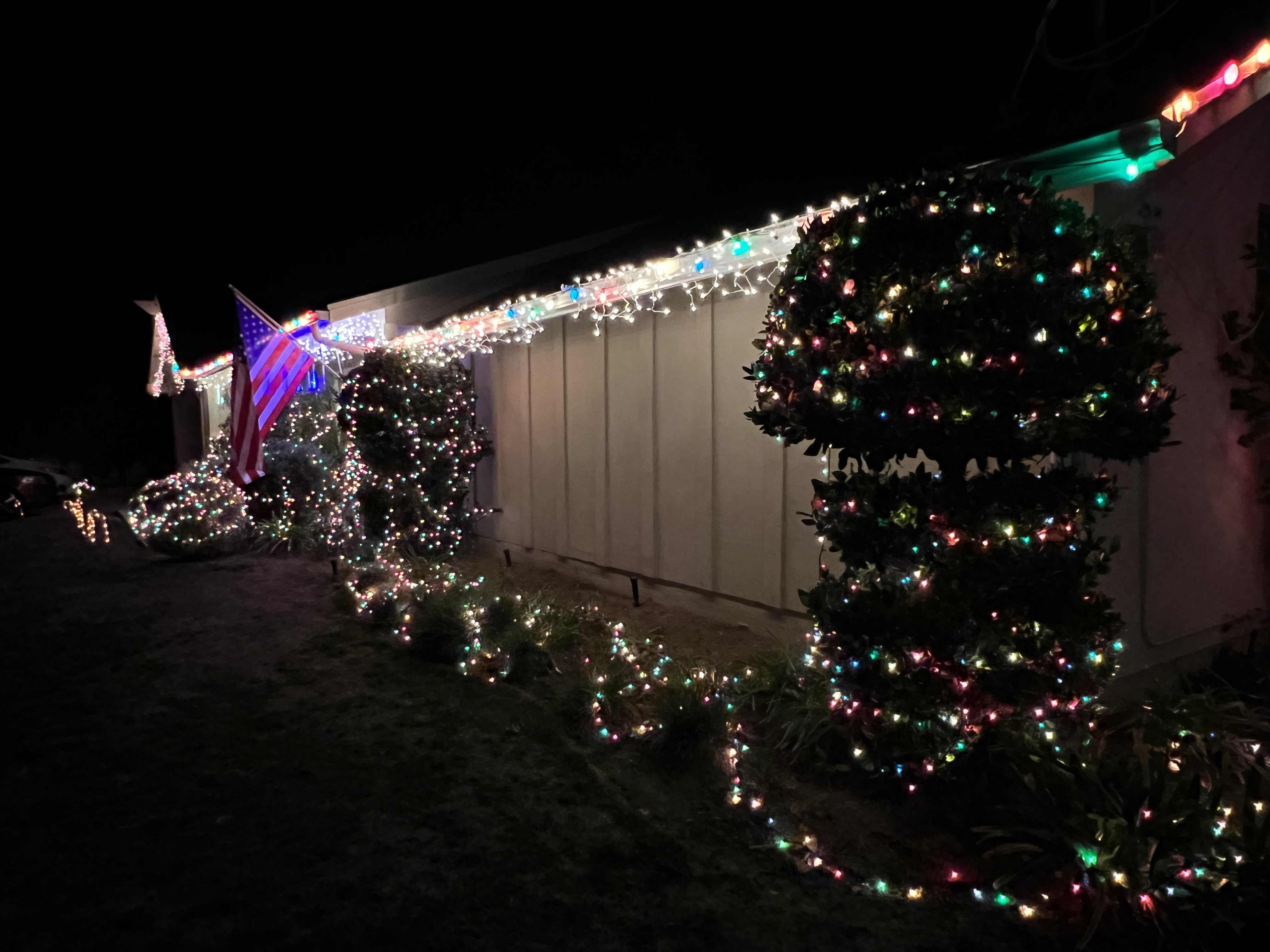 I would like to think that we’ve been a good influence on the neighbors. In past years there’s only been one or two who put up a string or two of lights. This year we’ve got six of the nine houses up here at the top of the hill who have lights up, most of them with several.