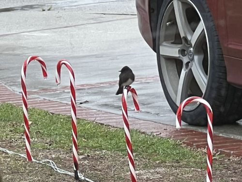 It was cold and wet, but I’m sure that sitting on the fake, illuminated candy cane filled it’s little heart with joy.