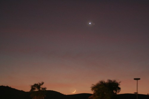 It was great to see the moon slipping below the Calabasas hills, at one point with the lit crescent part below the ridge but still with part of the Earthshine-illuminated upper arc still visible. I would share that with you but all of those pictures look like I was taking them from a trampoline mounted on a roller coaster, so you’ll have to trust me on this one and use your imagination.