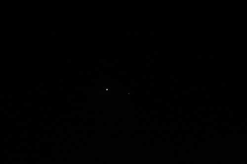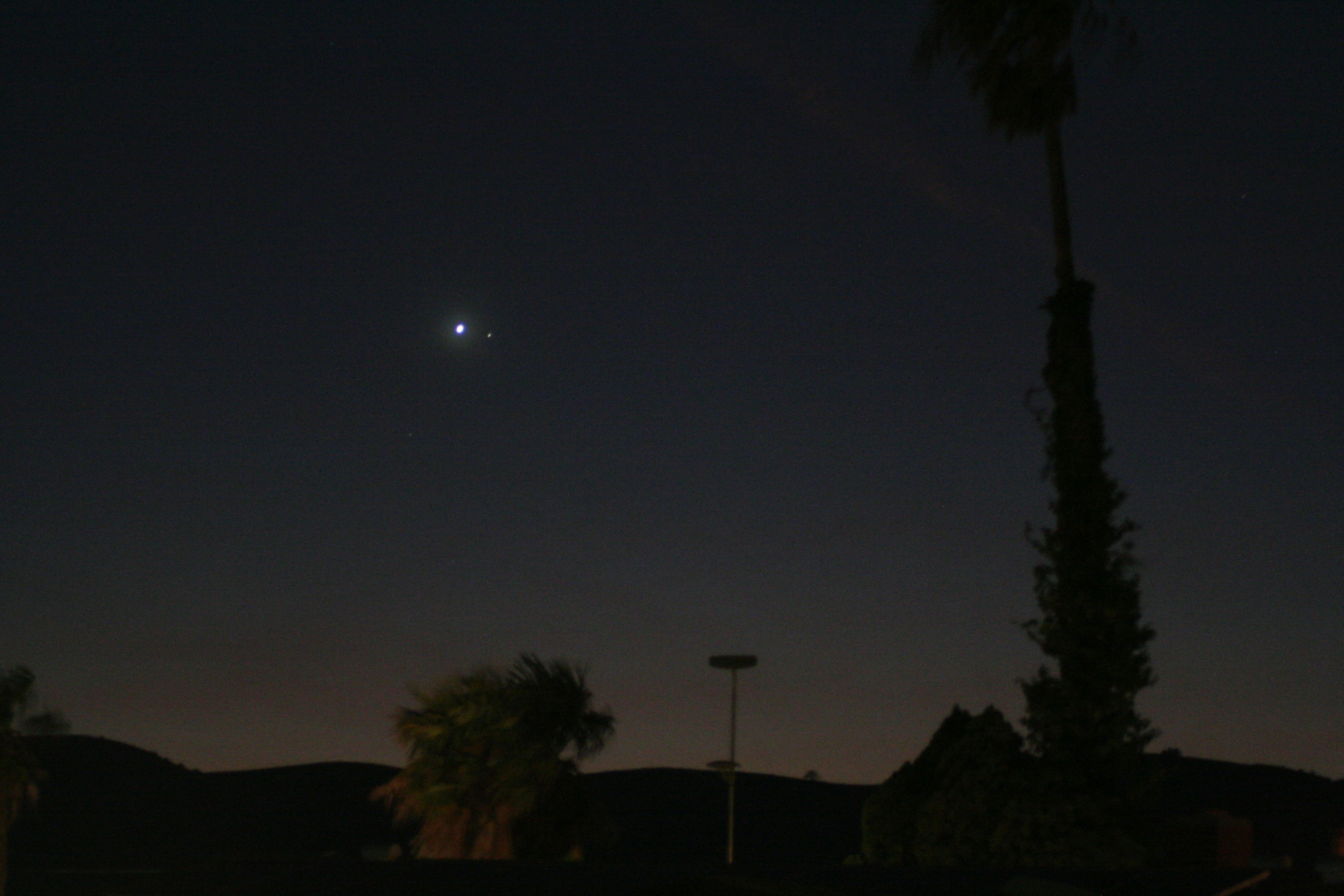 As it finally got dark I could see Saturn, but it was definately dimmer than last night, caused by the thin, high cloud layer. But you can see how Saturn has moved relative to Venus, past it to the right and down toward the horizon. (Of course, remember that it’s your relative view that’s changing, we’re all seperated by almost a billion miles and they only look “near” each other since we happen to be at a particular spot in our relative orbits as we all circle the sun.)