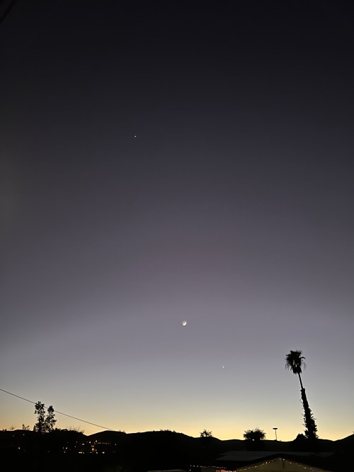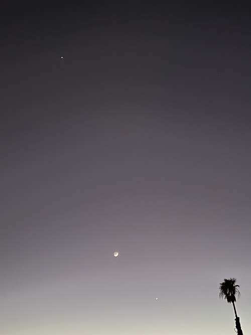 The moon is now three days old, something like 16% illuminated. Saturn is now well below Venus, much different than just two days ago. You can only wonder what the ancients thought of that, the “stars” moving around in what HAD to be a permanently fixed heaven.