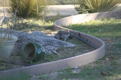 It was breakfast time, the birds had been fed, and the entire yard was covered with mourning doves, black-eyed juncos, and house wrens. The hummingbirds were at their feeder. And over by the tree was…something new.