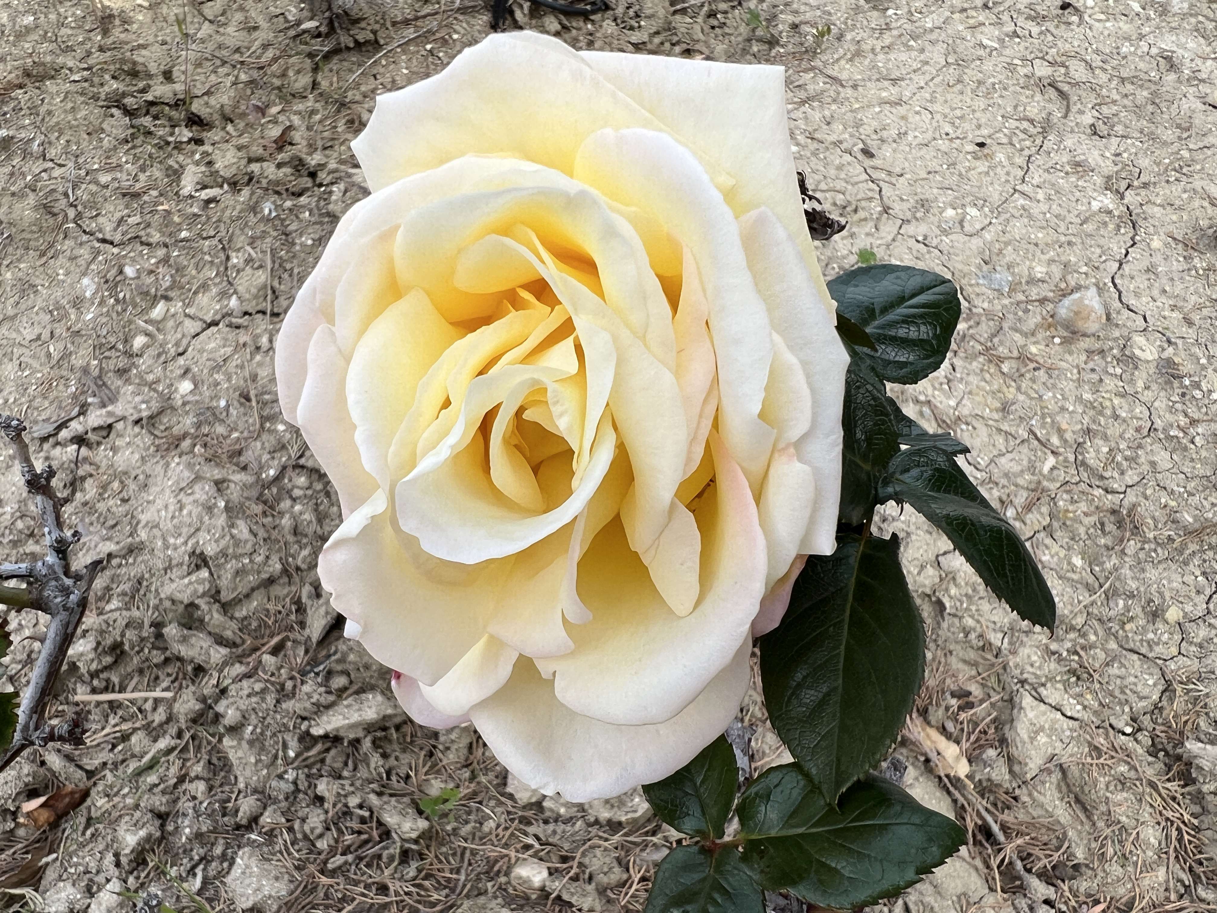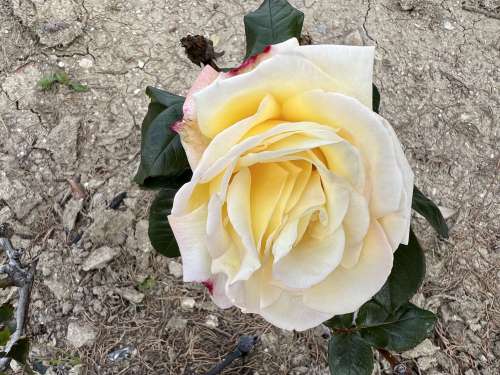 Out of the blue with little or no warning I found this full bloom yellow rose with some pink highlights out there yesterday morning.