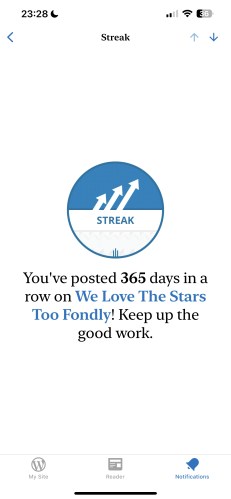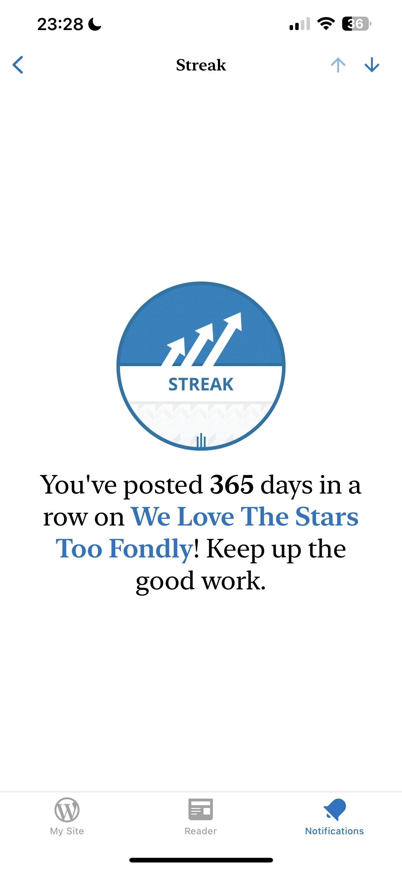 I’ve mentioned before (here) that WordPress gives you an “atta boy!” notification any time you post more than five or six days in a row. And, as a reminder, I’m easily amused, so it becomes a thing to keep the streak going.