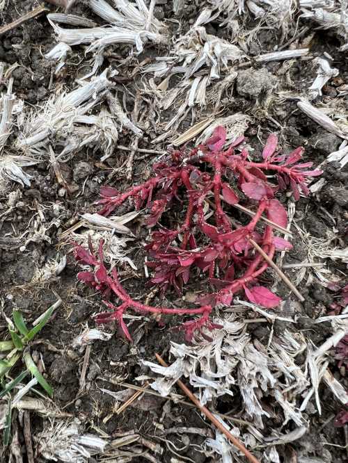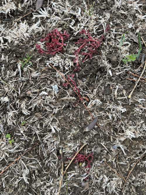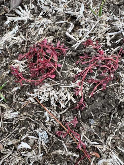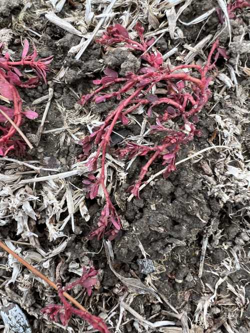 The whole area is maybe 8×11 inches, the size of a piece of paper. Red stems, red leaves.