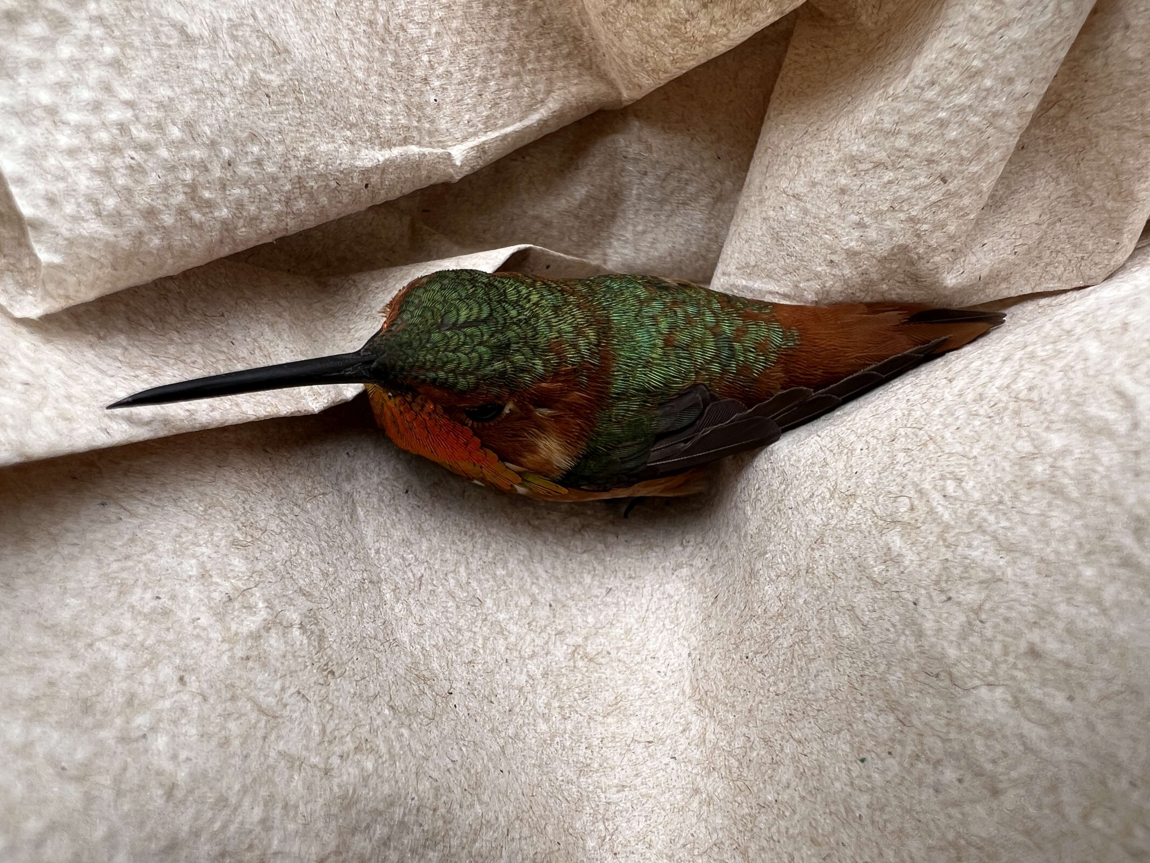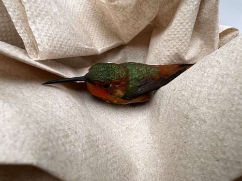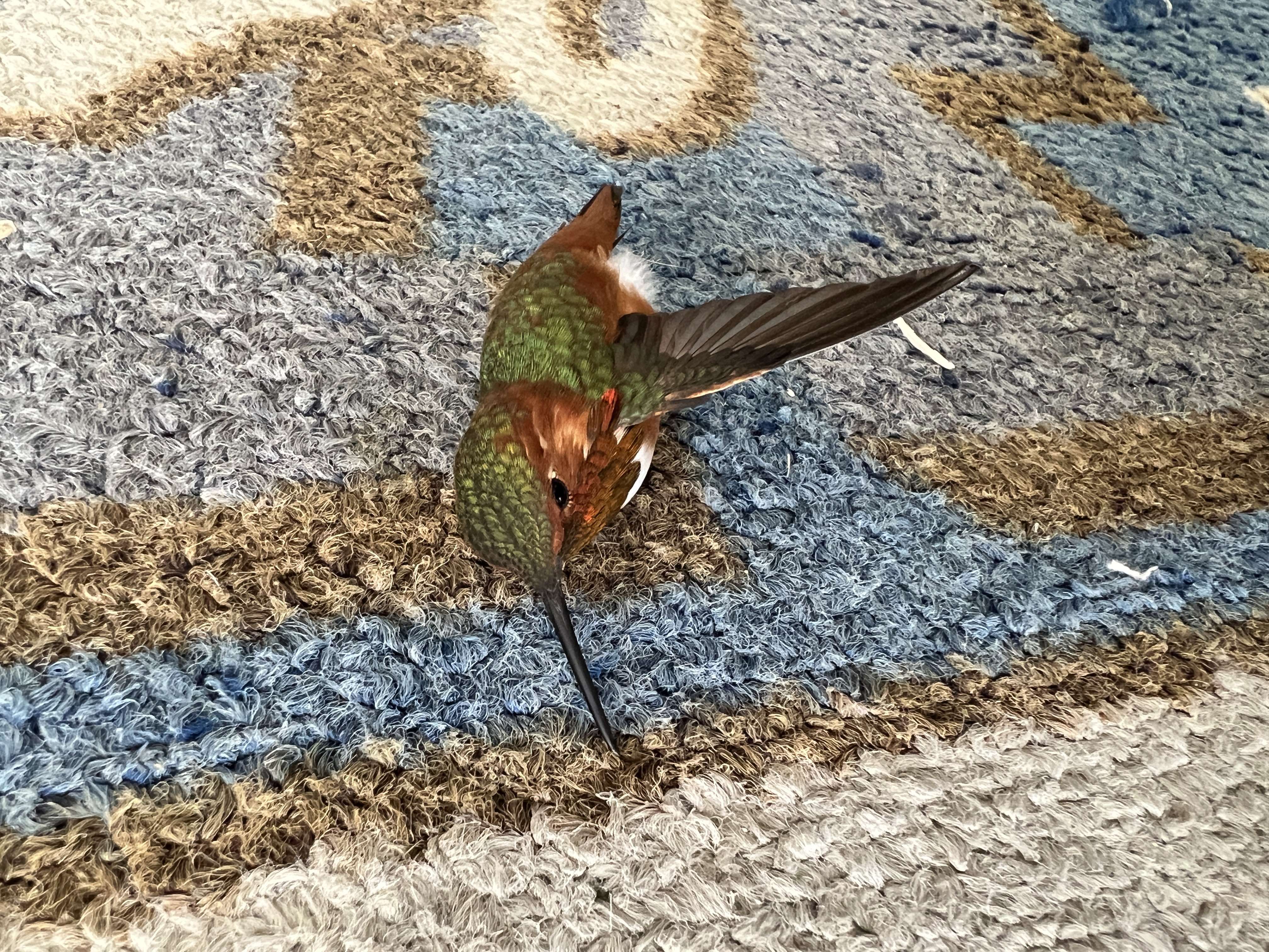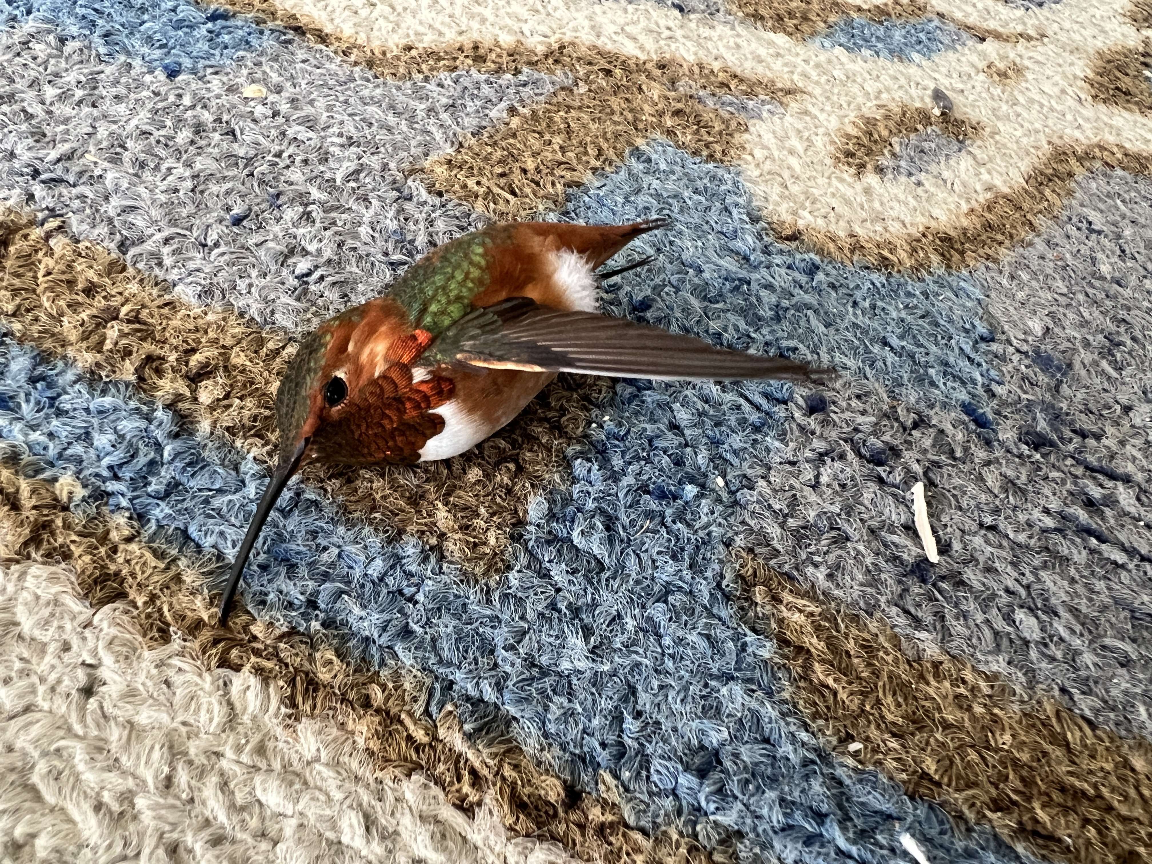 He was on the ground right at the base of the sliding glass door, so my best guess is that he flew into the glass. I figured he was dead.