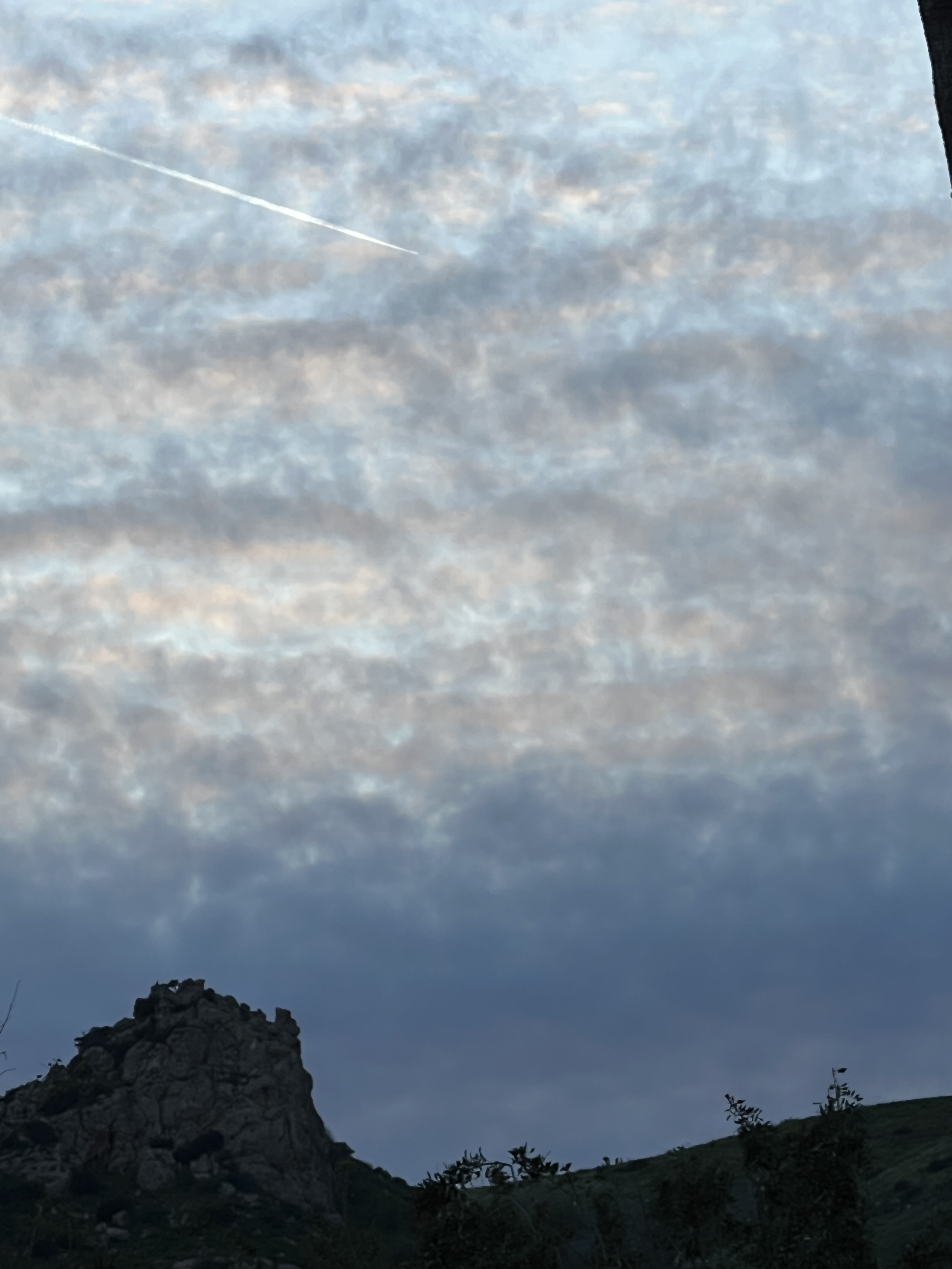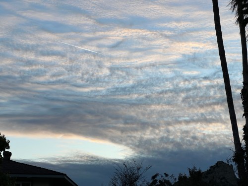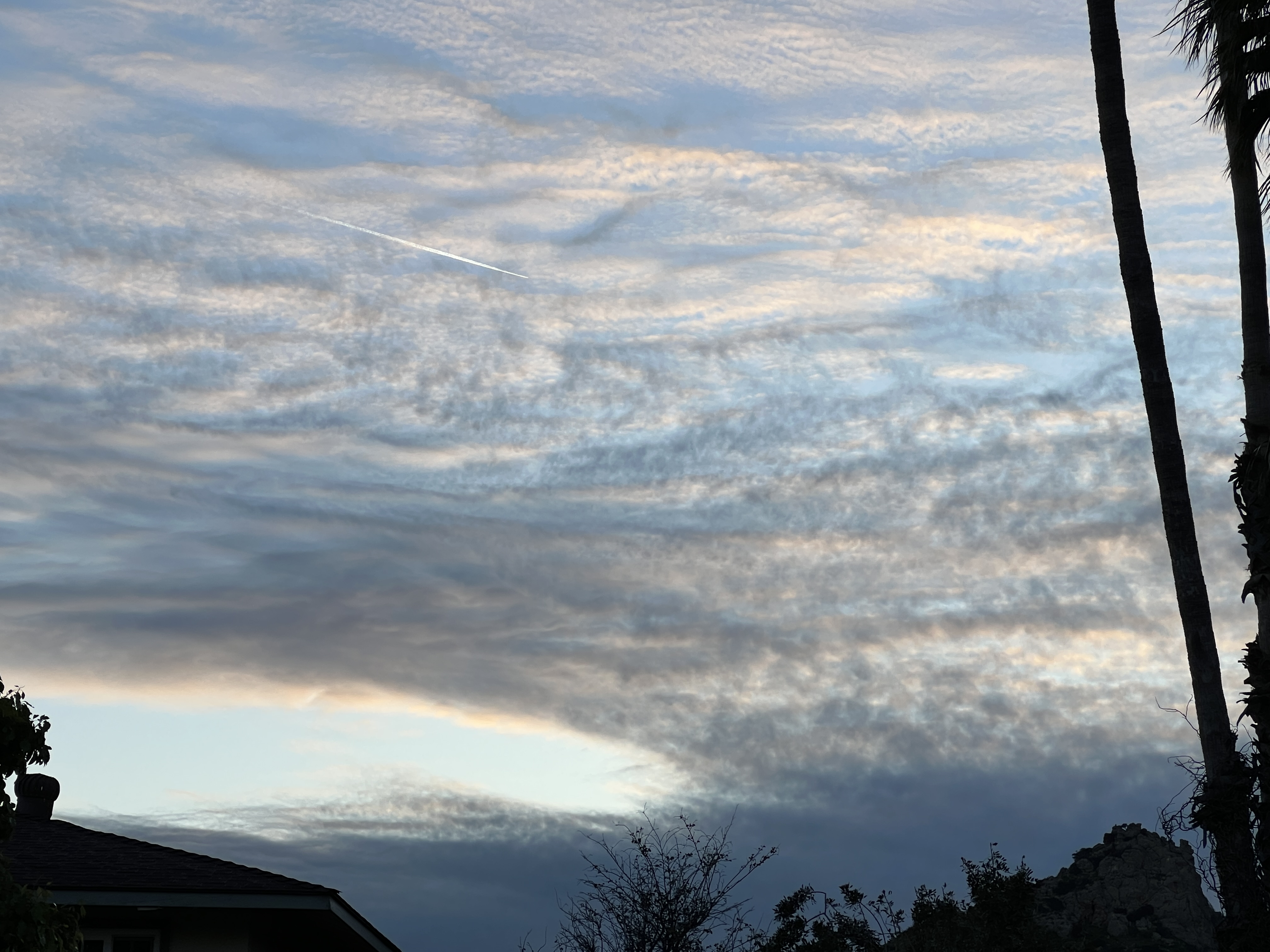 The clouds did have a little bit of iridescence, and it was clear overhead so I could see the quarter Moon, but the clouds were not only hiding dim Jupiter and Mercury but also obscuring my view of bright Venus and super dim Uranus up somewhere where that jet was passing by in the upper left.