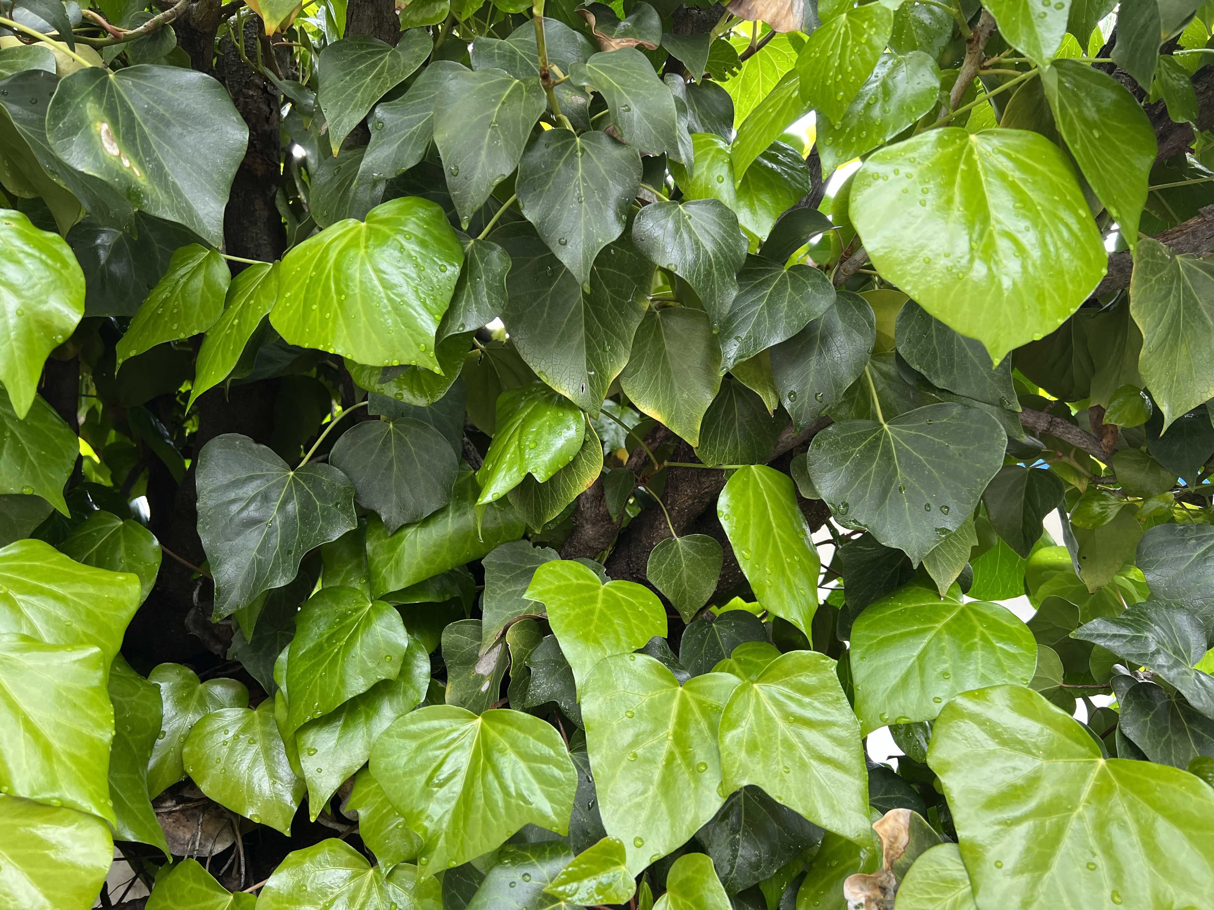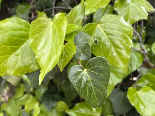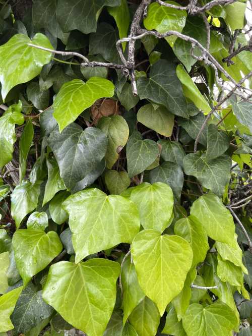 The difference in shades of green is very stark on this ivy, the older leaves being a dark green and the new leaves being much lighter and more yellow.