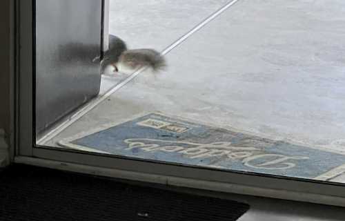 Squirrels! Again, it might be time for the little ones to learn how to dodge hawks. (And owls!) Usually we just have the one who eats all of the bird seed, but today, while he was out there in the yard, there were two others up against the sliding glass door that leads out to the porch. Our regular guy ignores me most of the time, but the two peeking into the house were freaked out by my arrival and took off pretty quick.