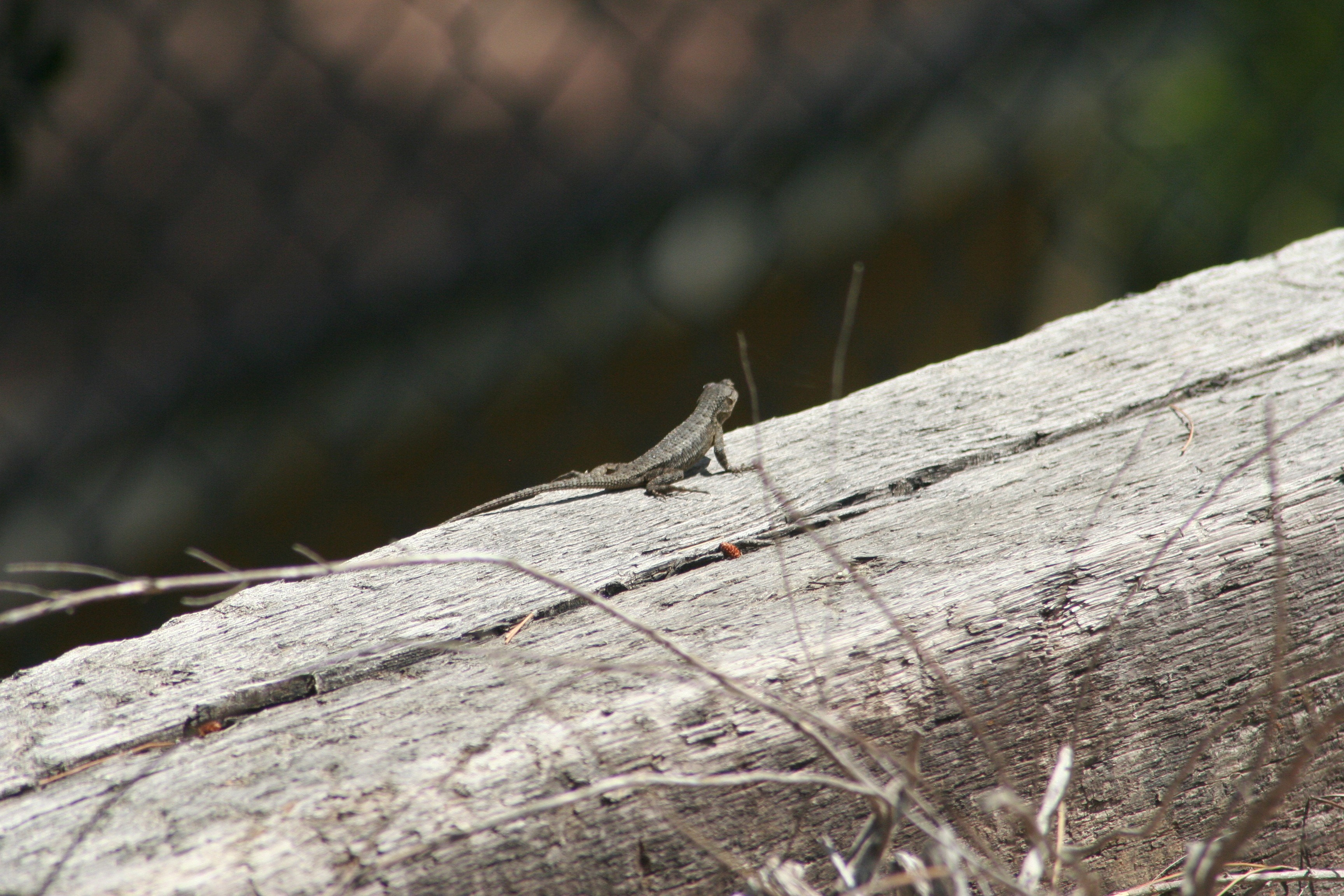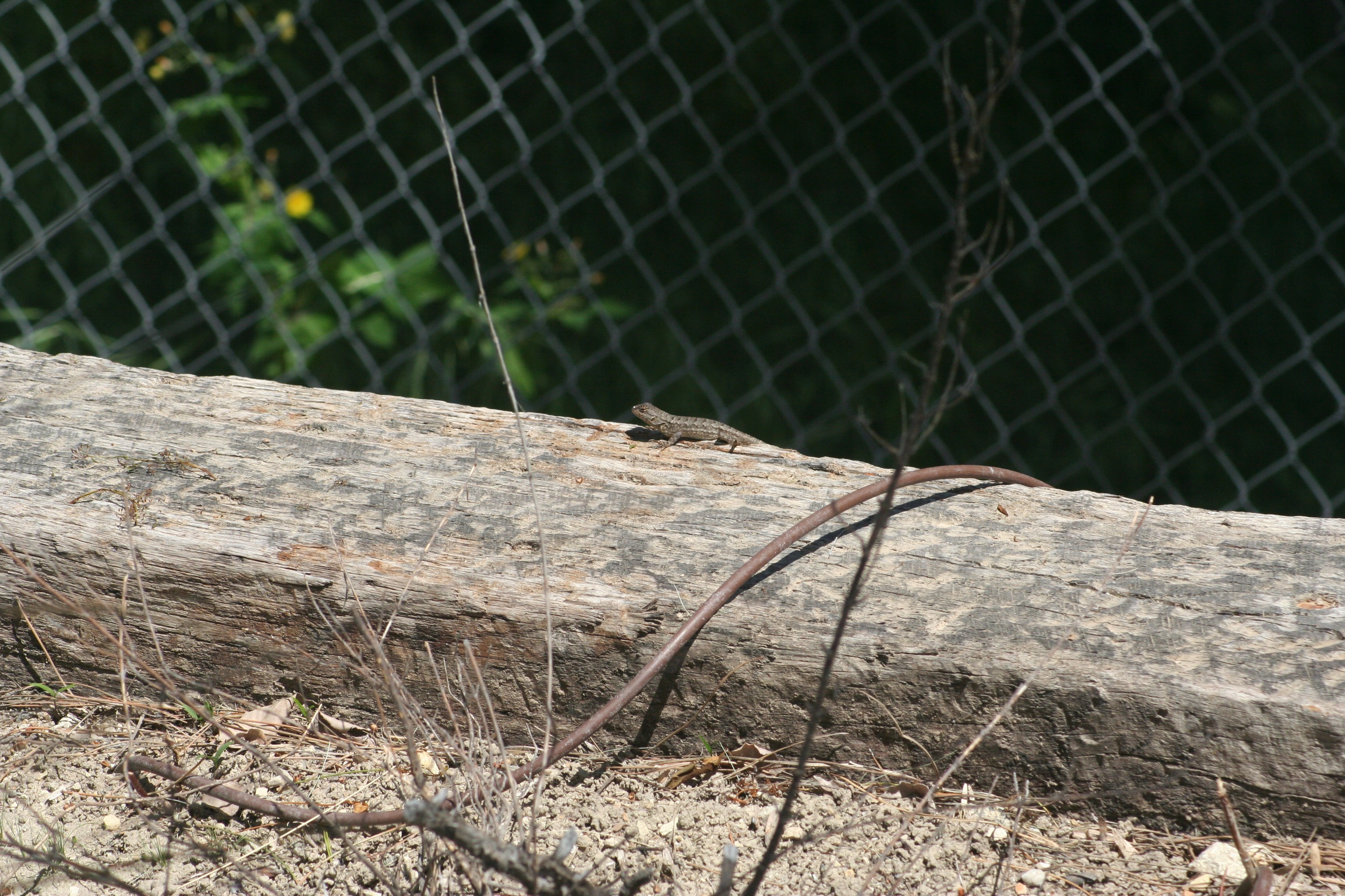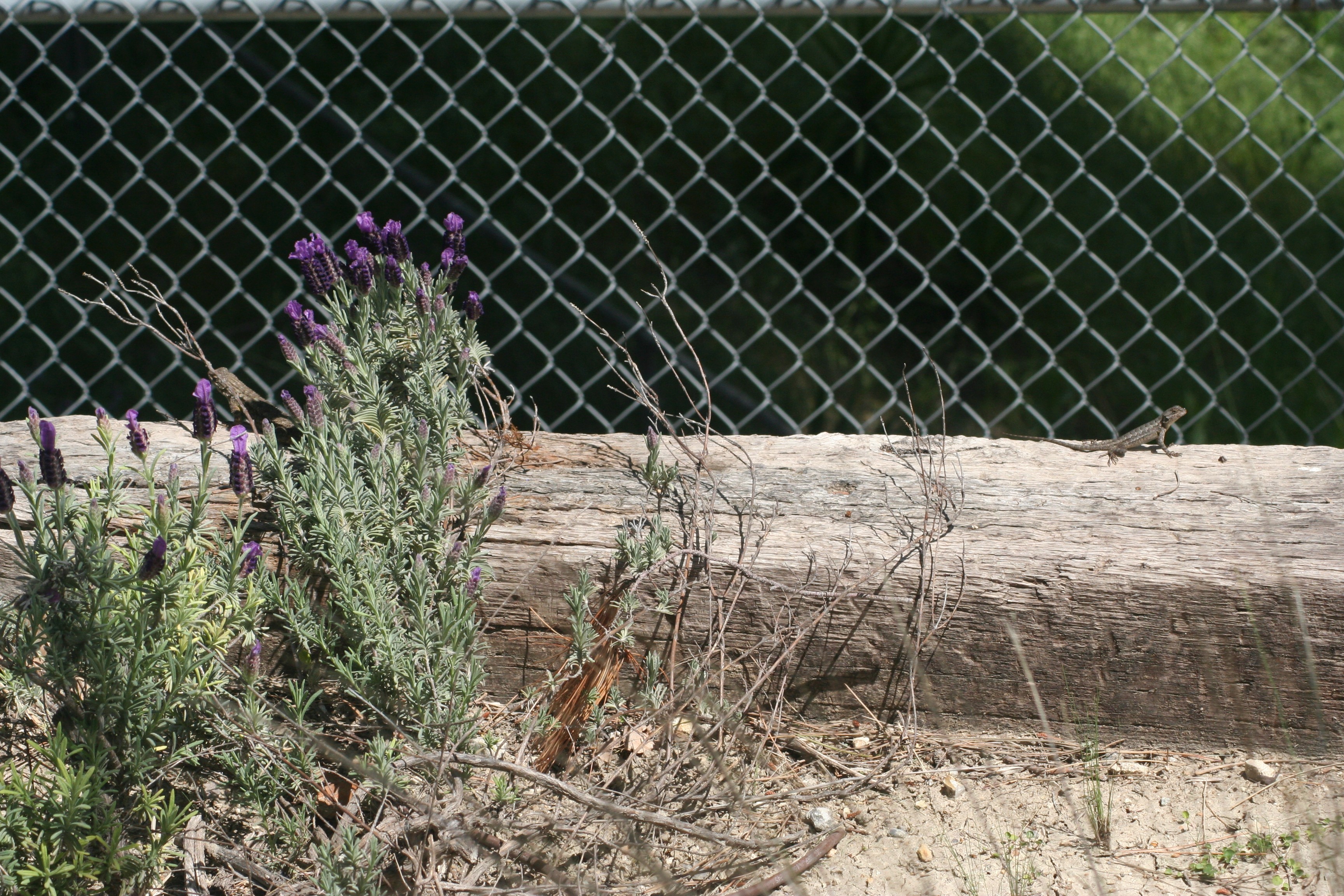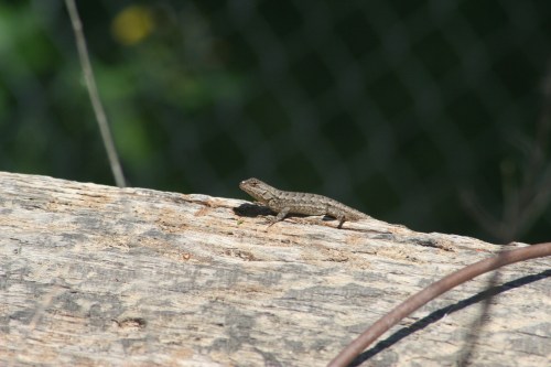 Yesterday I had pictures of a large fence lizard, something on the order of 10-12 inches long, involved in some territorial displays of his bright blue belly and push ups. The reason he was being so demonstrative was a smaller, younger, medium-sized lizard that was horning in on his spot in the sun along the 6×6 railroad ties at the edge of the yard.