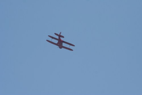 It’s a Beech 17 to be exact, but they’re referred to as Staggerwings. A bi-plane with a negative bias in the alignment of the wings, which improved the stability quite a bit near stall speeds. A stunningly gorgeous plane.