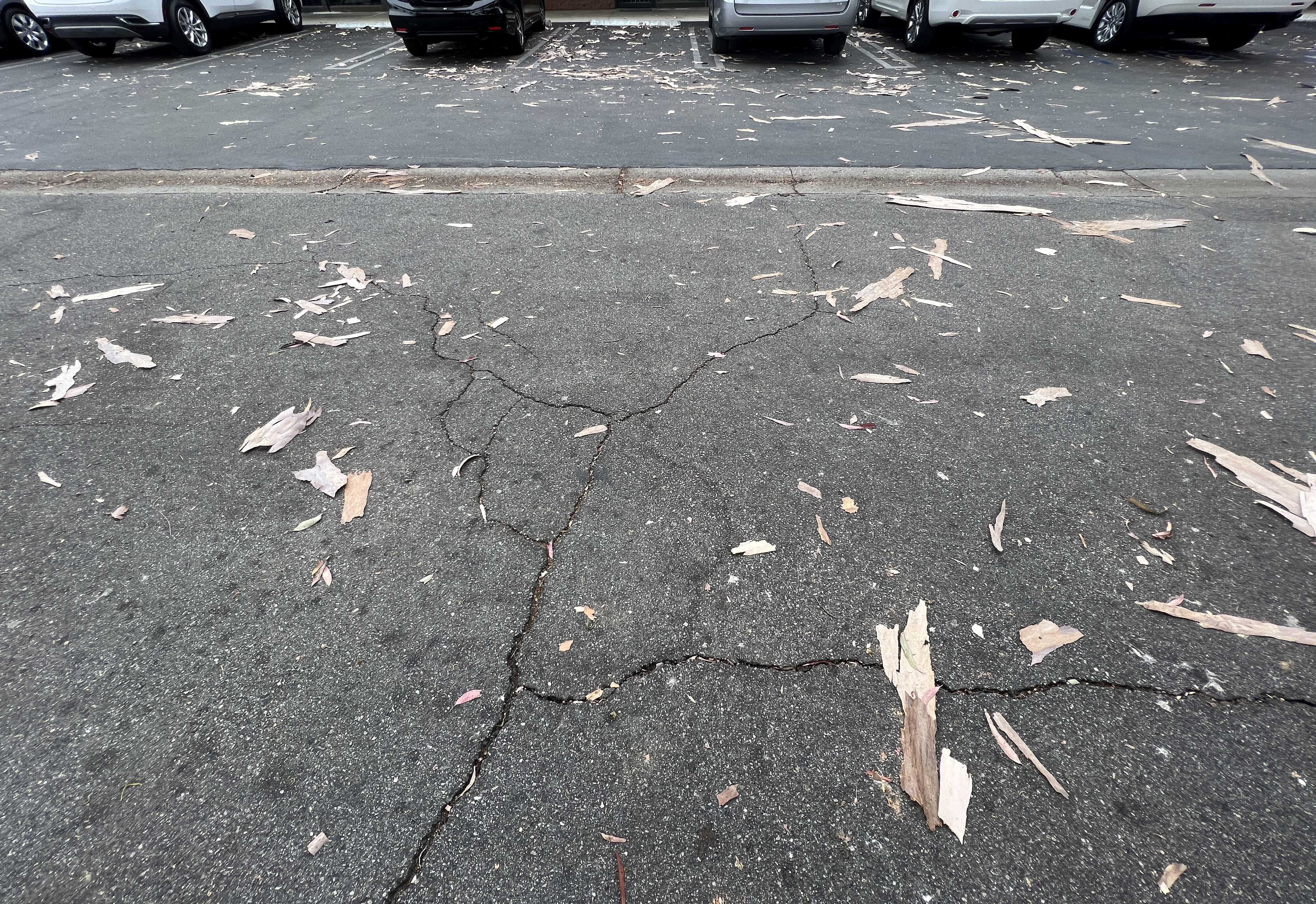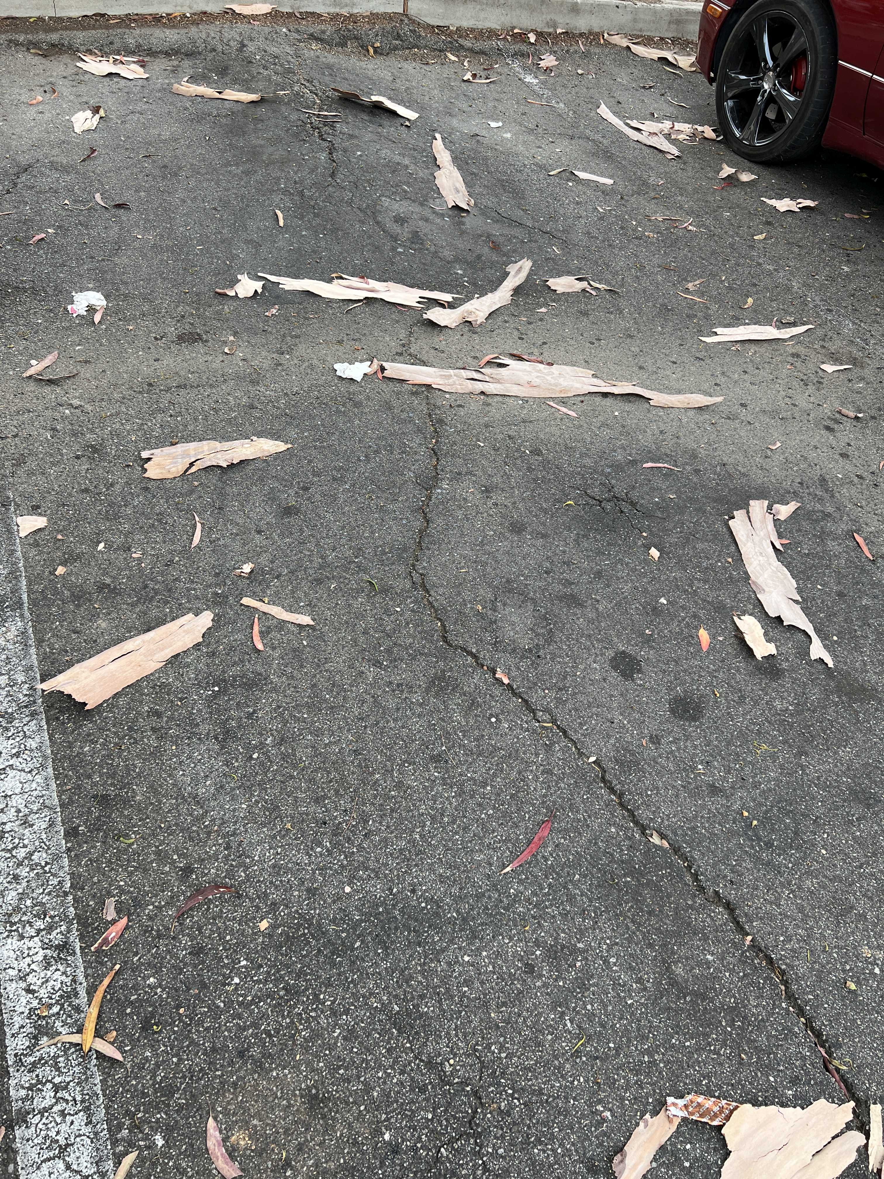 Yesterday I found the entire parking lot littered with thin strips and patches of eucalyptus bark as the whole grove had decided to shed together almost overnight.