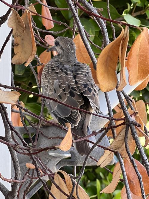 Now clearly seen as a mourning dove fledgeling. The coloration is all wrong for a mourning dove, but normal for a fledgeling who is likely to get out of the nest and get stuck on the ground where it would be an easy meal. Our subject wasn’t too thrilled with the photos, so once again it remembered that it was capable (sort of) of flight, and made it all the way across the street, where it discovered that it didn’t yet know how to land in a tree and perch. After something of a crashy sort of coming to a halt (any landing’s a good one if you can walk away from it!) I left it alone.