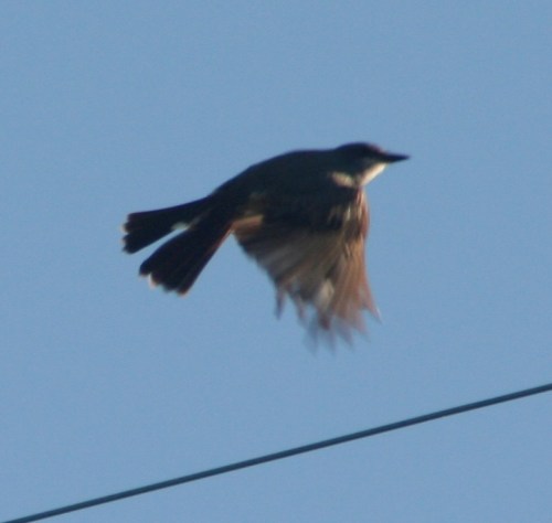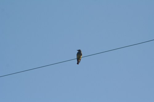 Taking pictures of hawks and other birds near sunset yesterday, I originally thought this was a mockingbird. We’re lousy with mockingbirds this summer (including this nest which gave us three more) and there were a couple others sitting on the wires nearby.