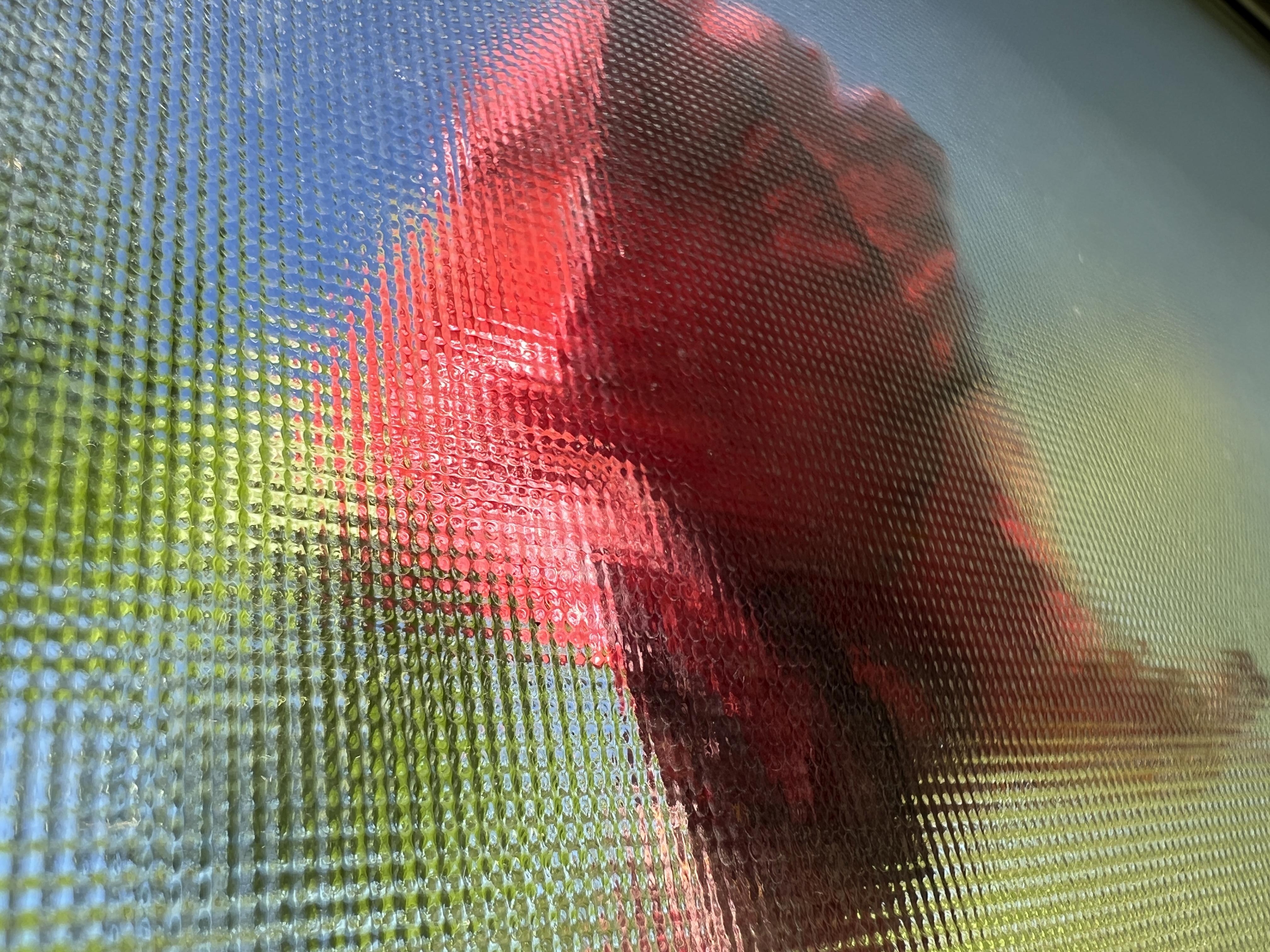 Outside of my bathroom window is a hibiscus plant which I’ve shared before. One morning recently I found that one of the large, flaming red hibiscus flowers had turned away from the sun and was pressed up against the glass. With the sun streaming directly in through the window (as you migh surmise, I am NOT an early riser) the intensity of the red flower and green leaves, broken up by the thousands of tiny prisms in the bathroom window glass, was almost overwhelming.