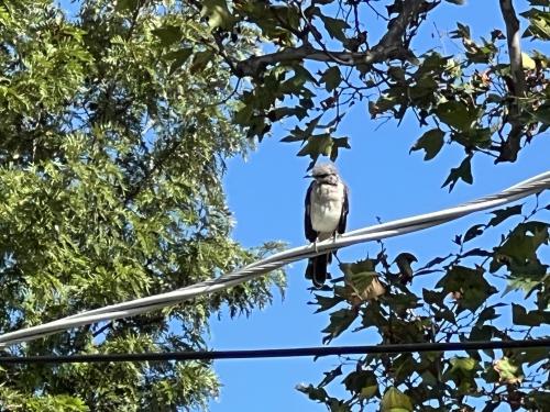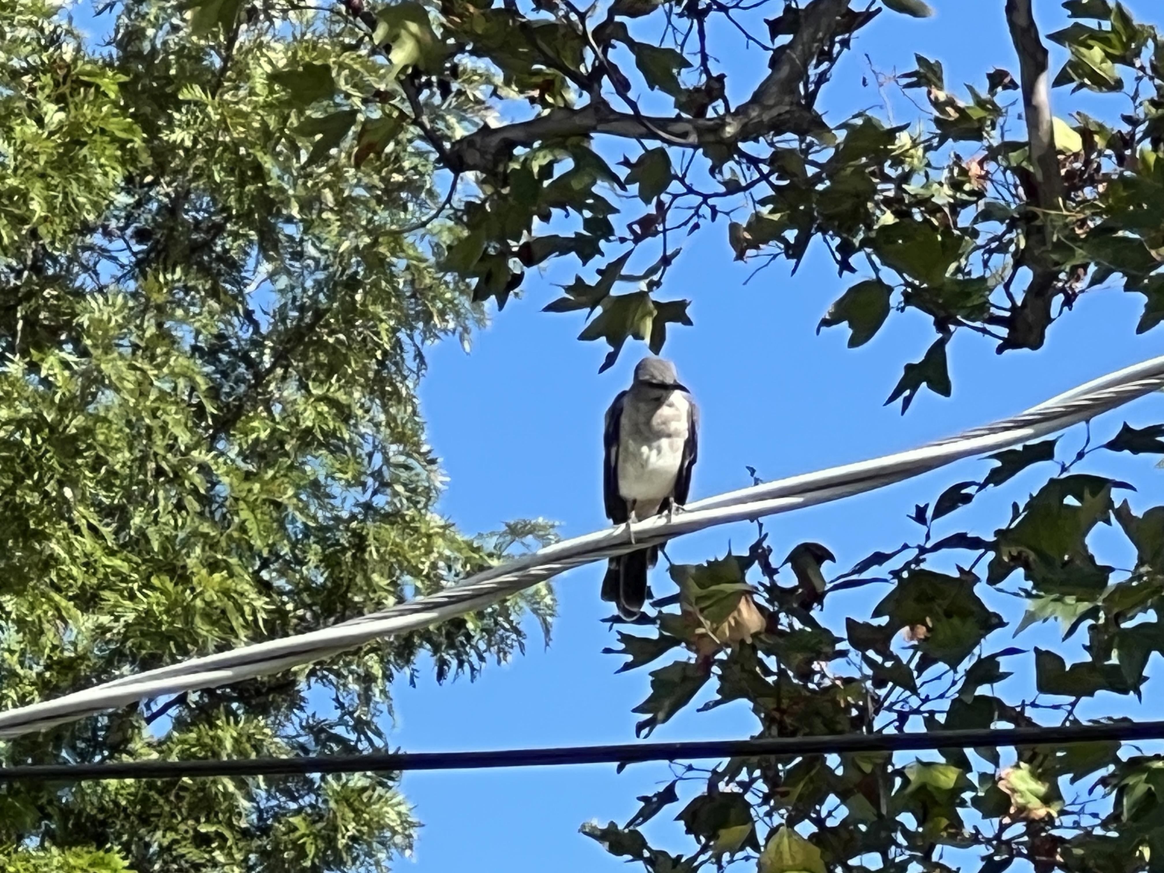 I think it’s a juvenile. The coloration is a bit different than normal, but the Merlin app says it’s a mockingbird when it sounds off.