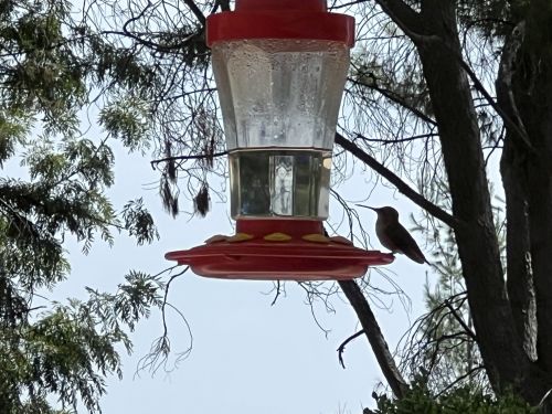 The feeder can easily handle eight or more hummers, but it’s rare to see two there because he chases them off. Very territorial!
