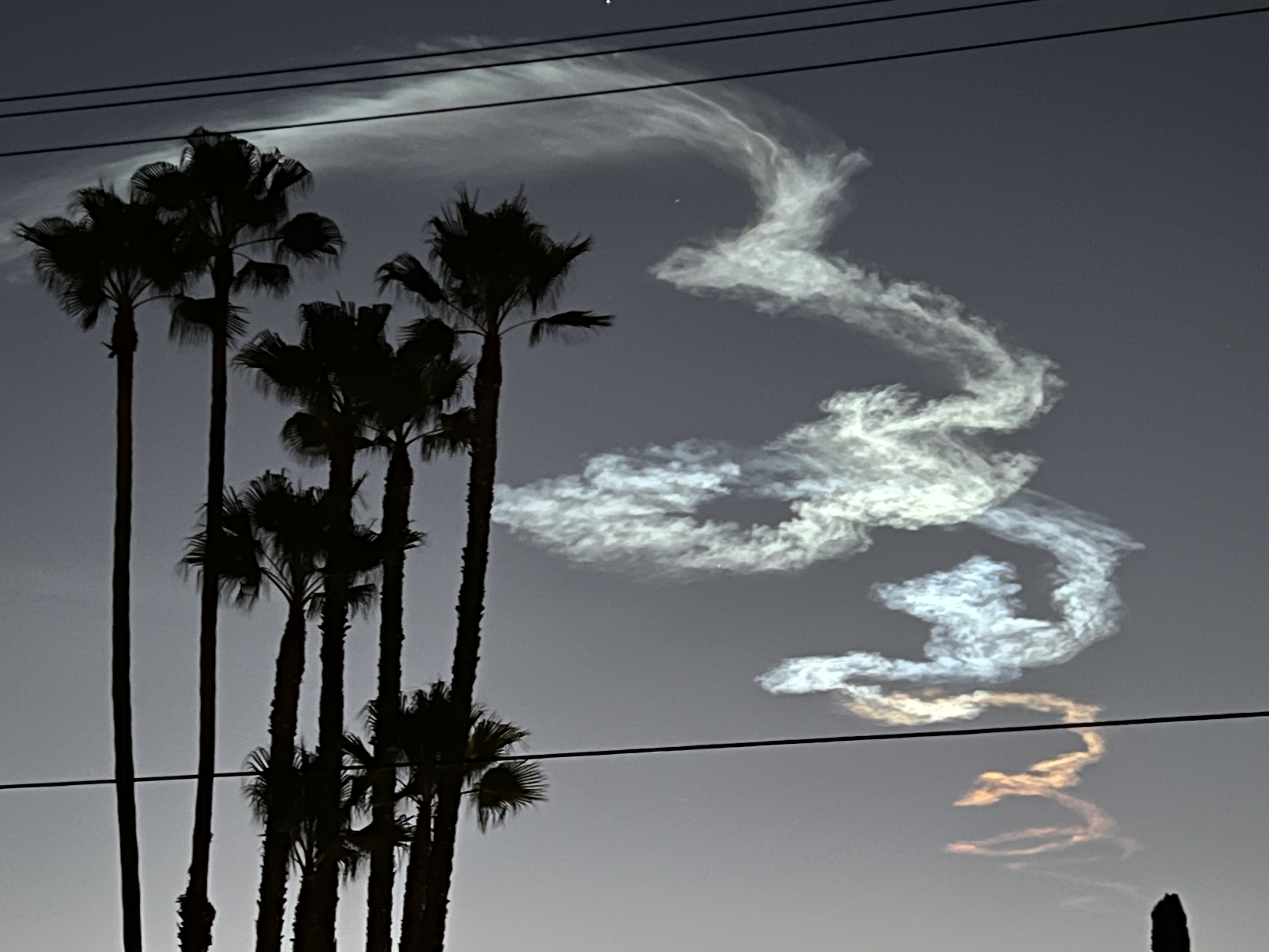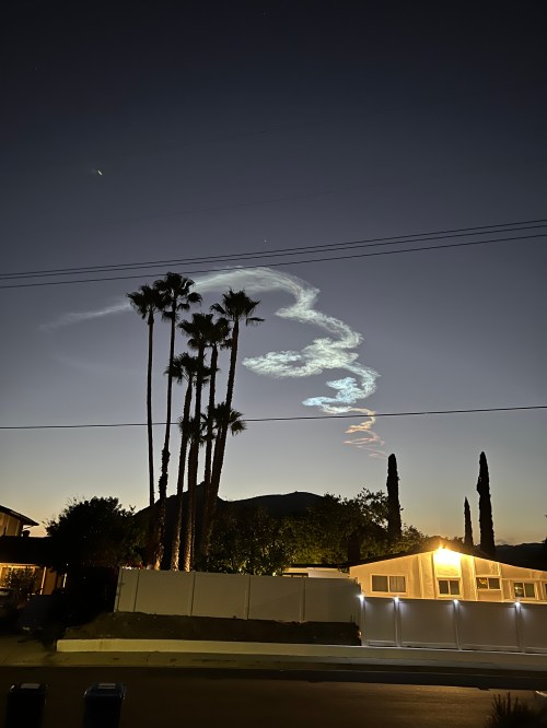 The lower part of the exhaust trail, deep in the sunset atmosphere, is orange and red, turning white as it climbs up higher in the atmosphere where it’s still fully illuminated by the sun off in the west.