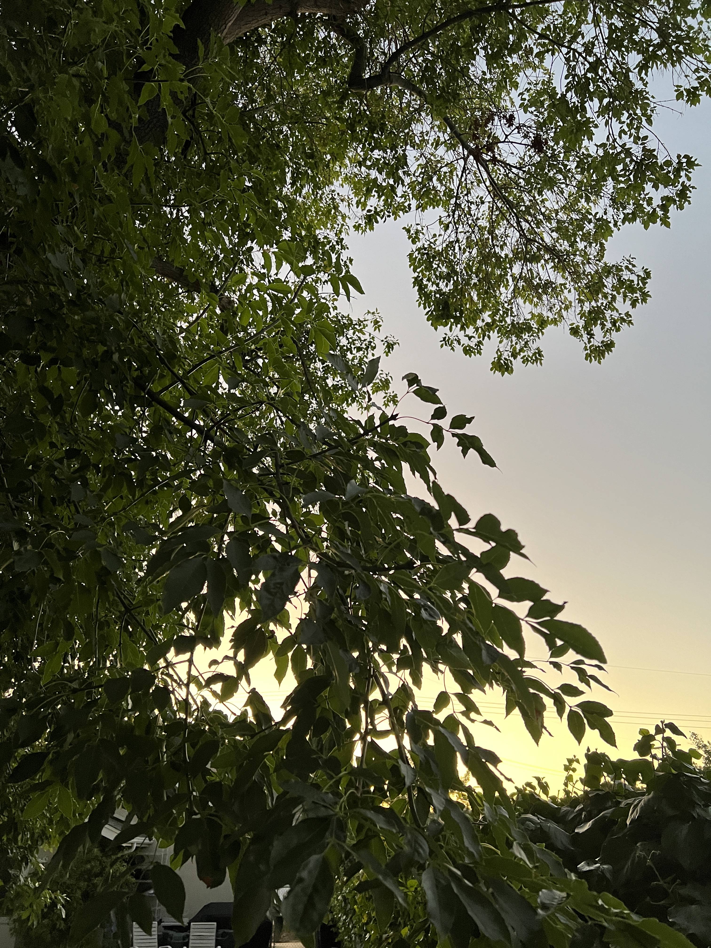 However, I was out walking in the back yard and glanced up while I was under all of the overgrown branches on the big tree. The dark green, almost black silhouettes of the leaves contrasted nicely with the bright but fading sunset sky beyond.