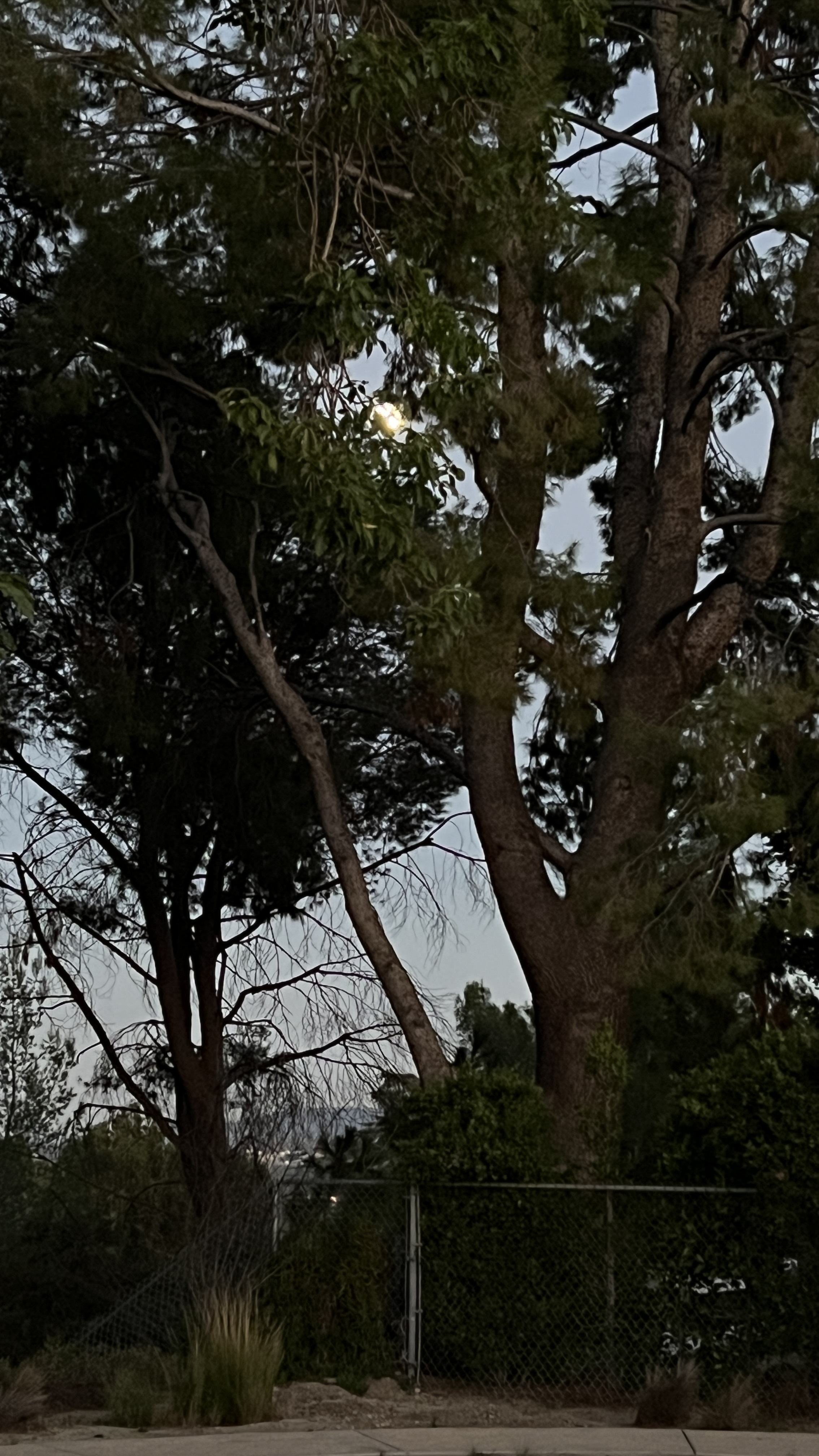 Meanwhile, 180º behind me, the Moon was well up, also partially hidden, but this time by the large pine trees going down the hill.