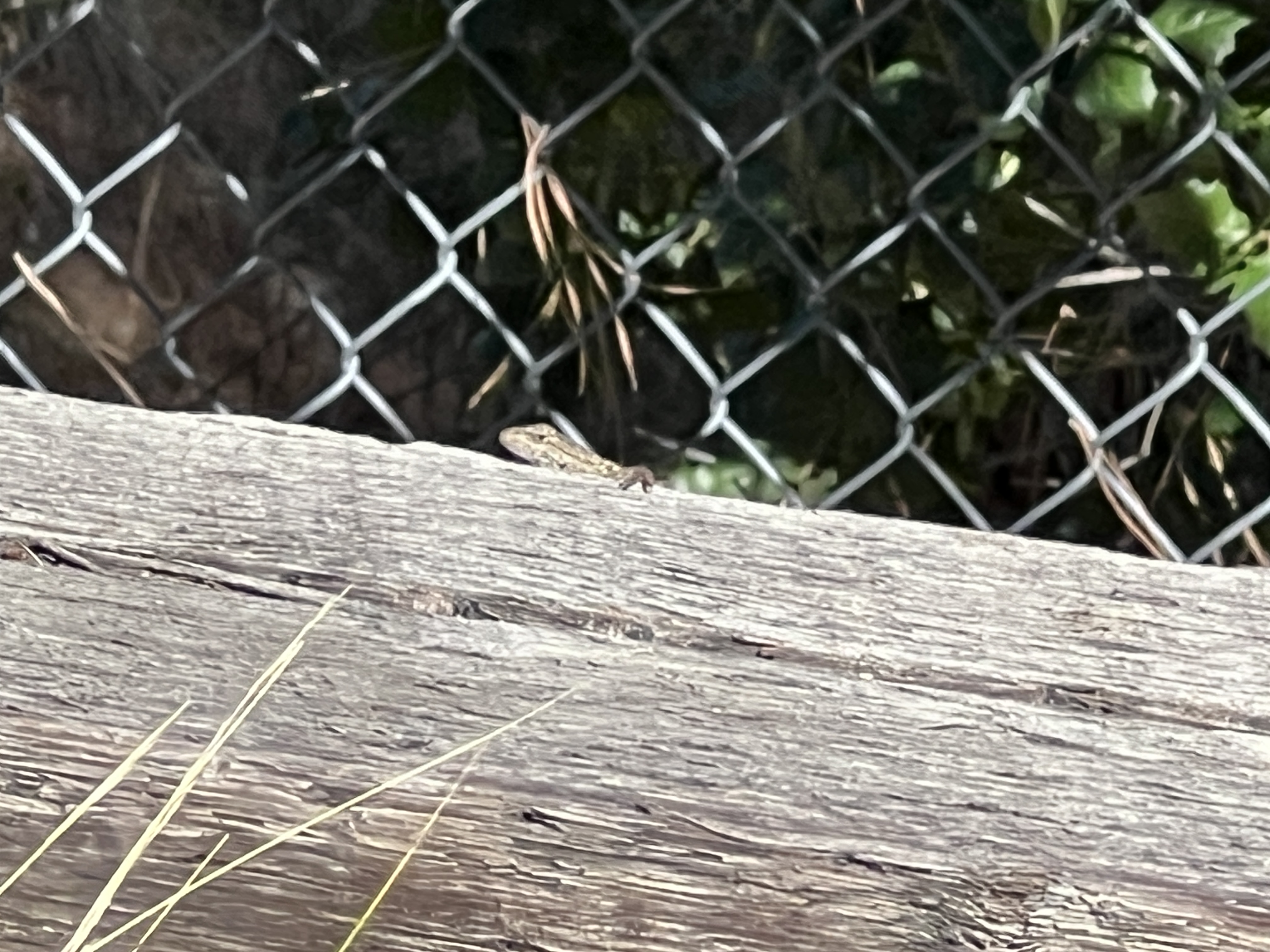 Finally he was way up above the edge, fully exposed. I didn’t move, but another, bigger lizard ran by from left to right along the top of the rail tie and freaked him out. He vanished back over the side in a flash.